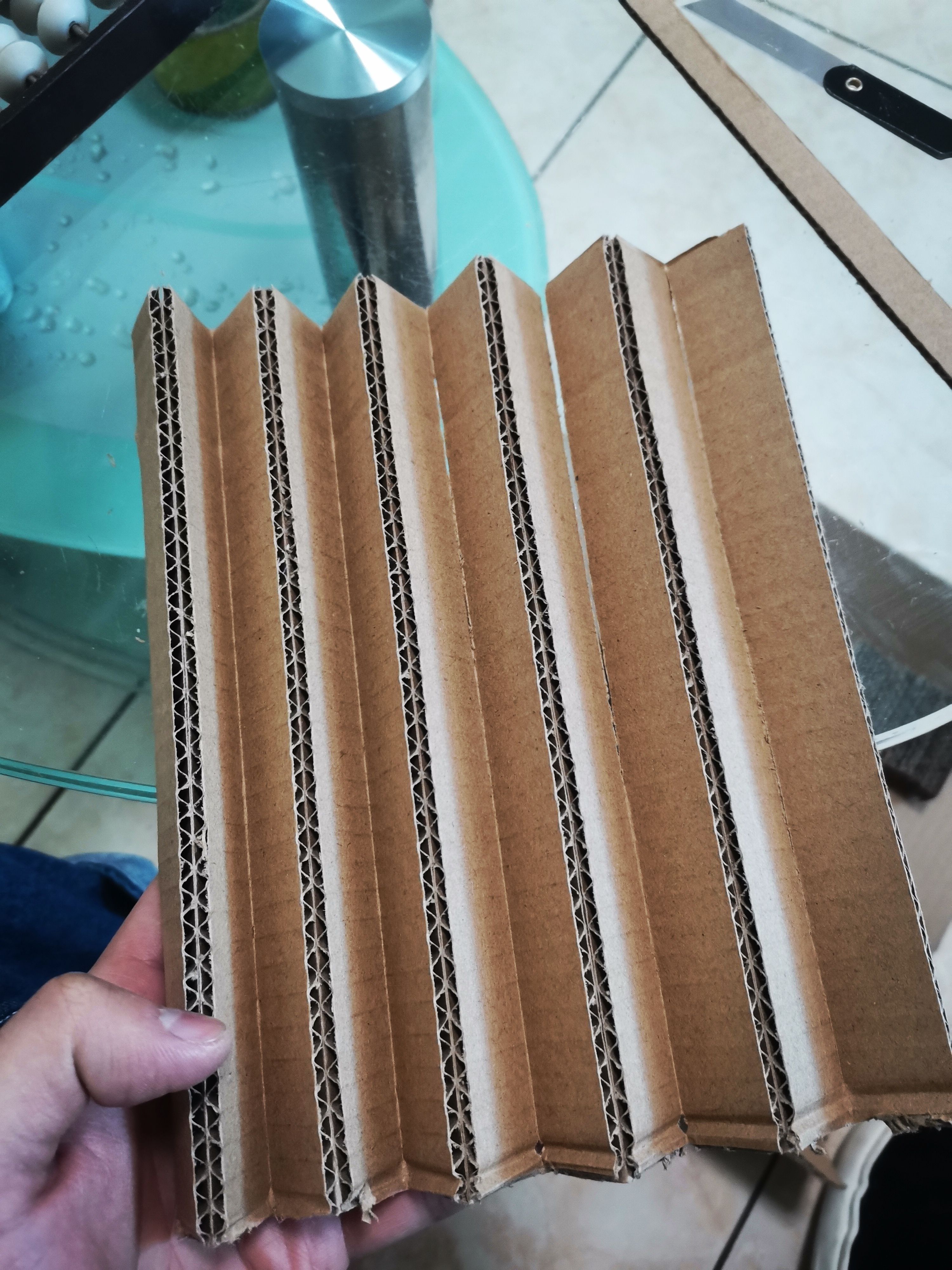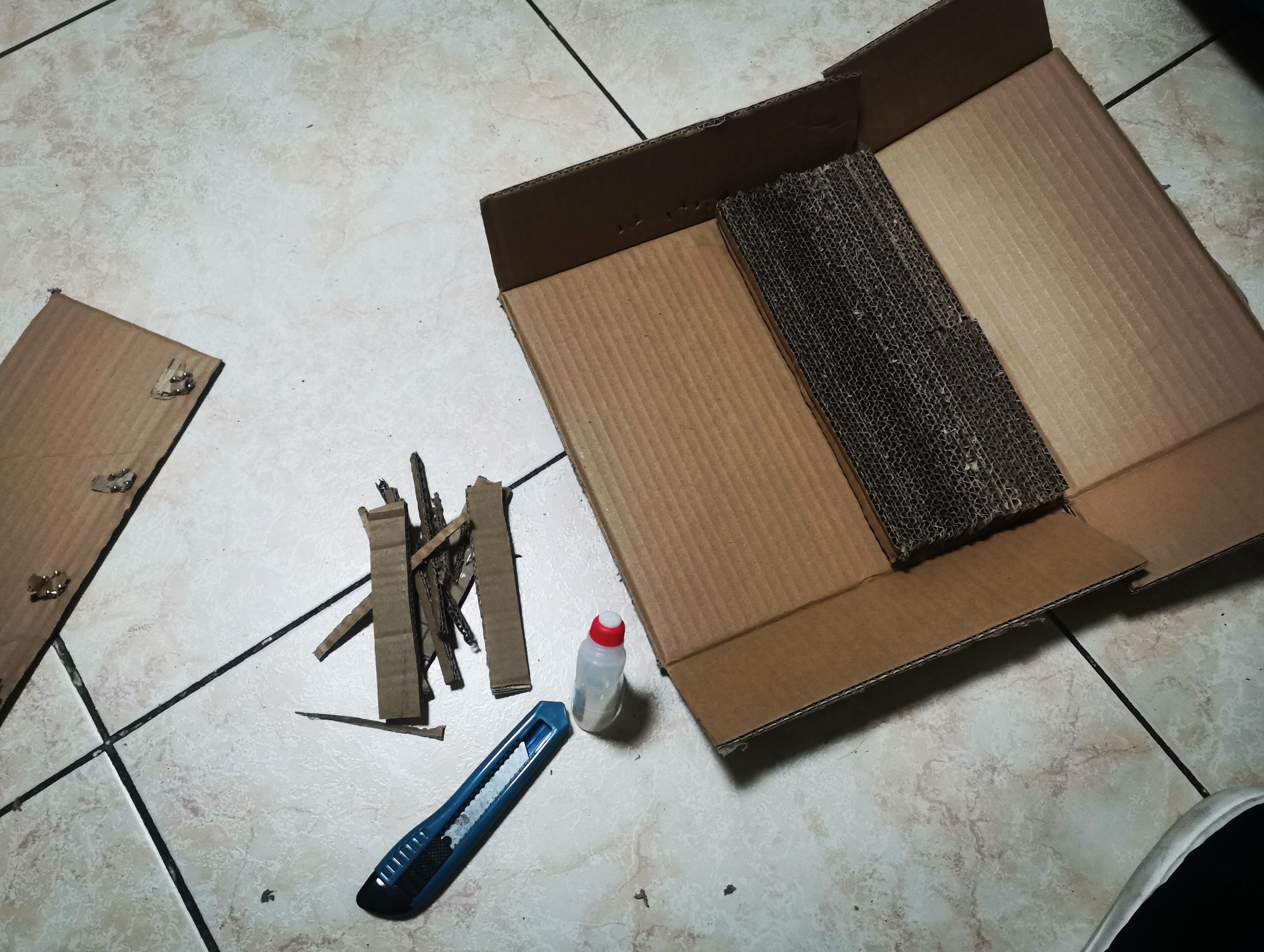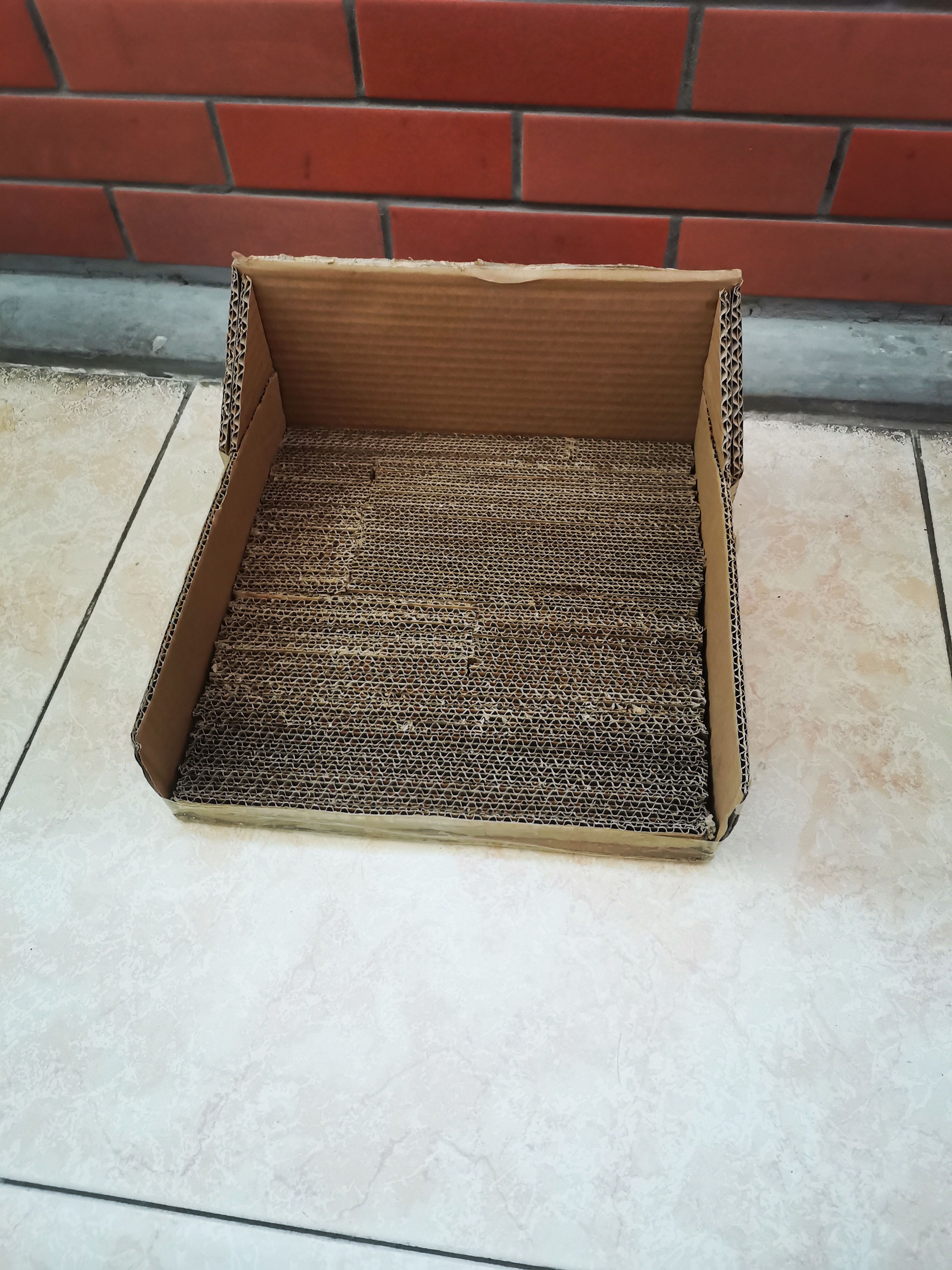 📦 准备不要的快递箱,看好尺寸裁成条。不要顺着纹路裁(裁完后横截面有好多孔✓)粘一起,粘成一块儿猫抓板做底座
