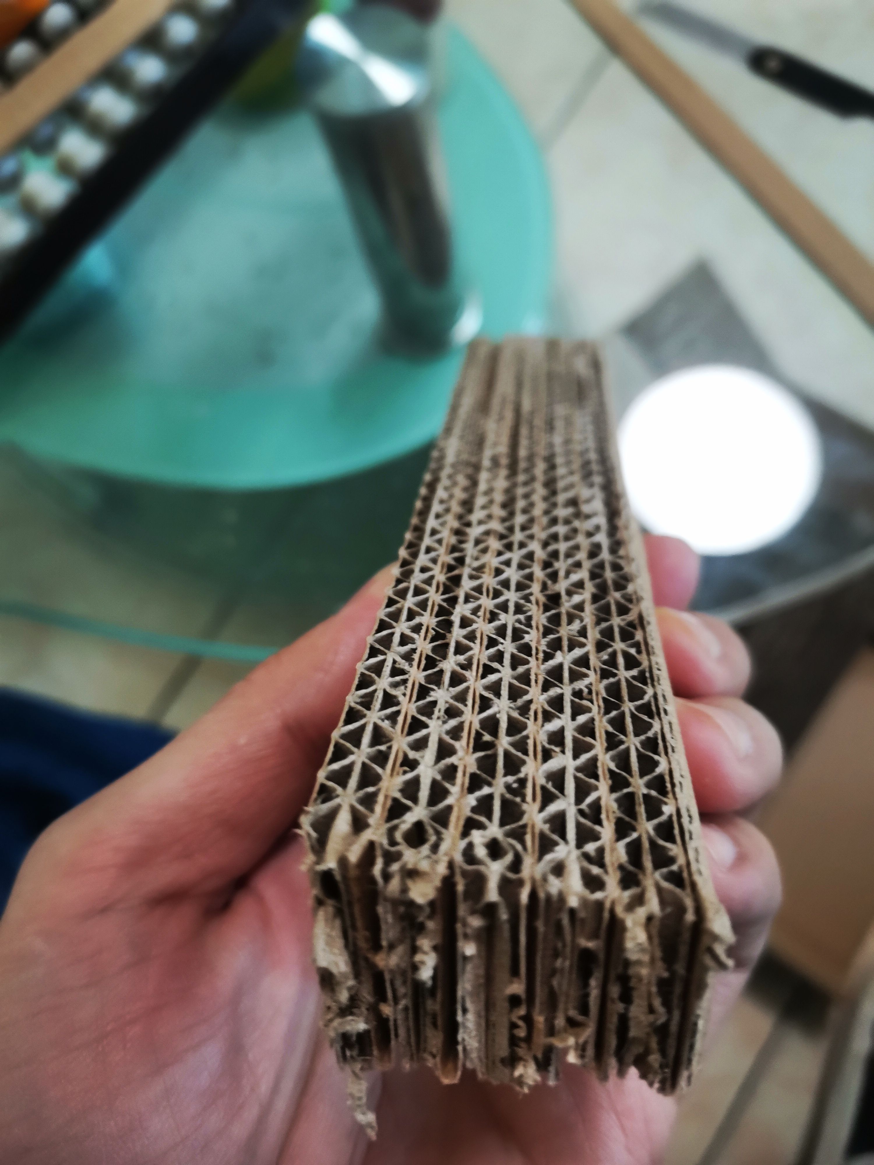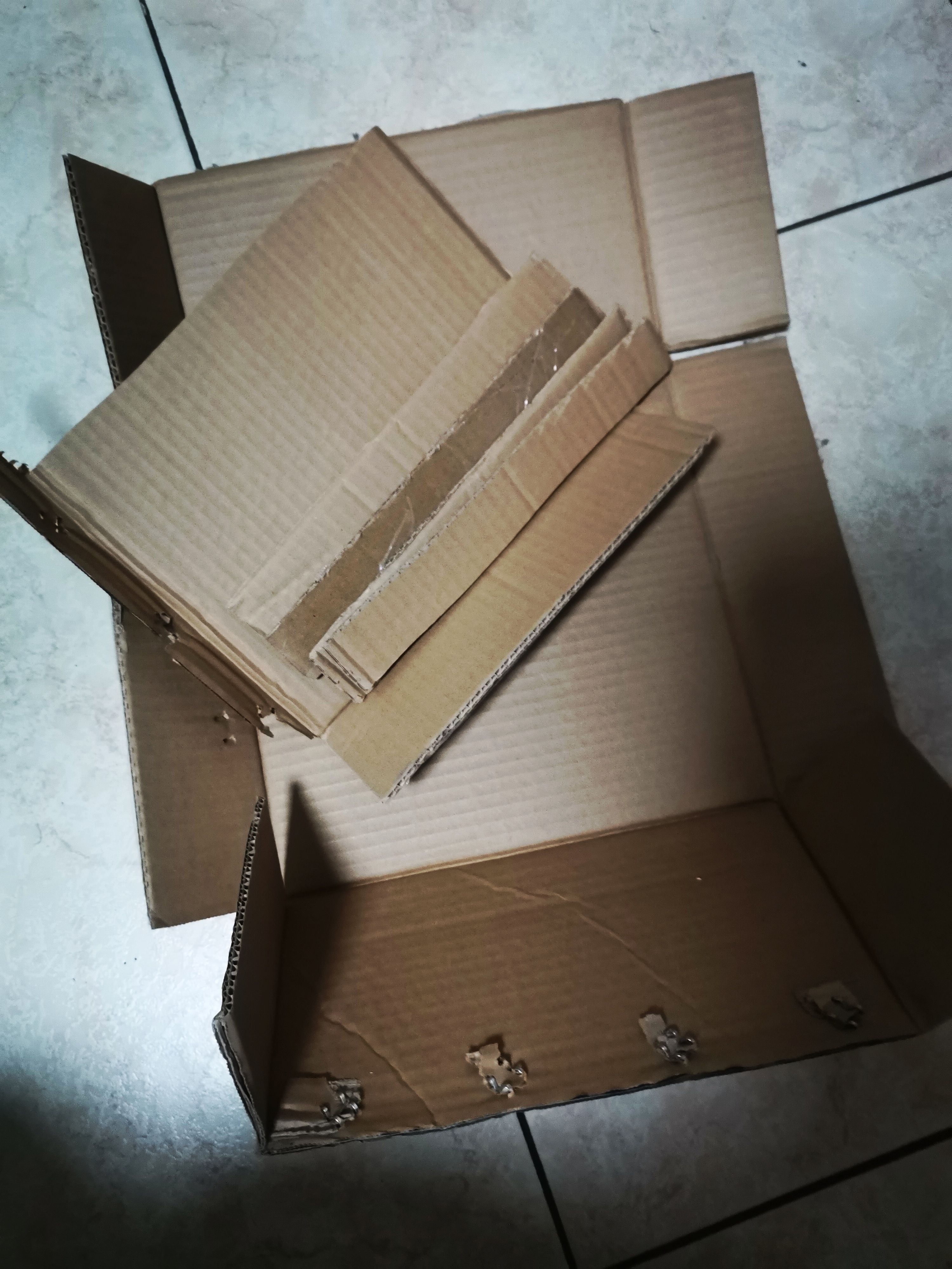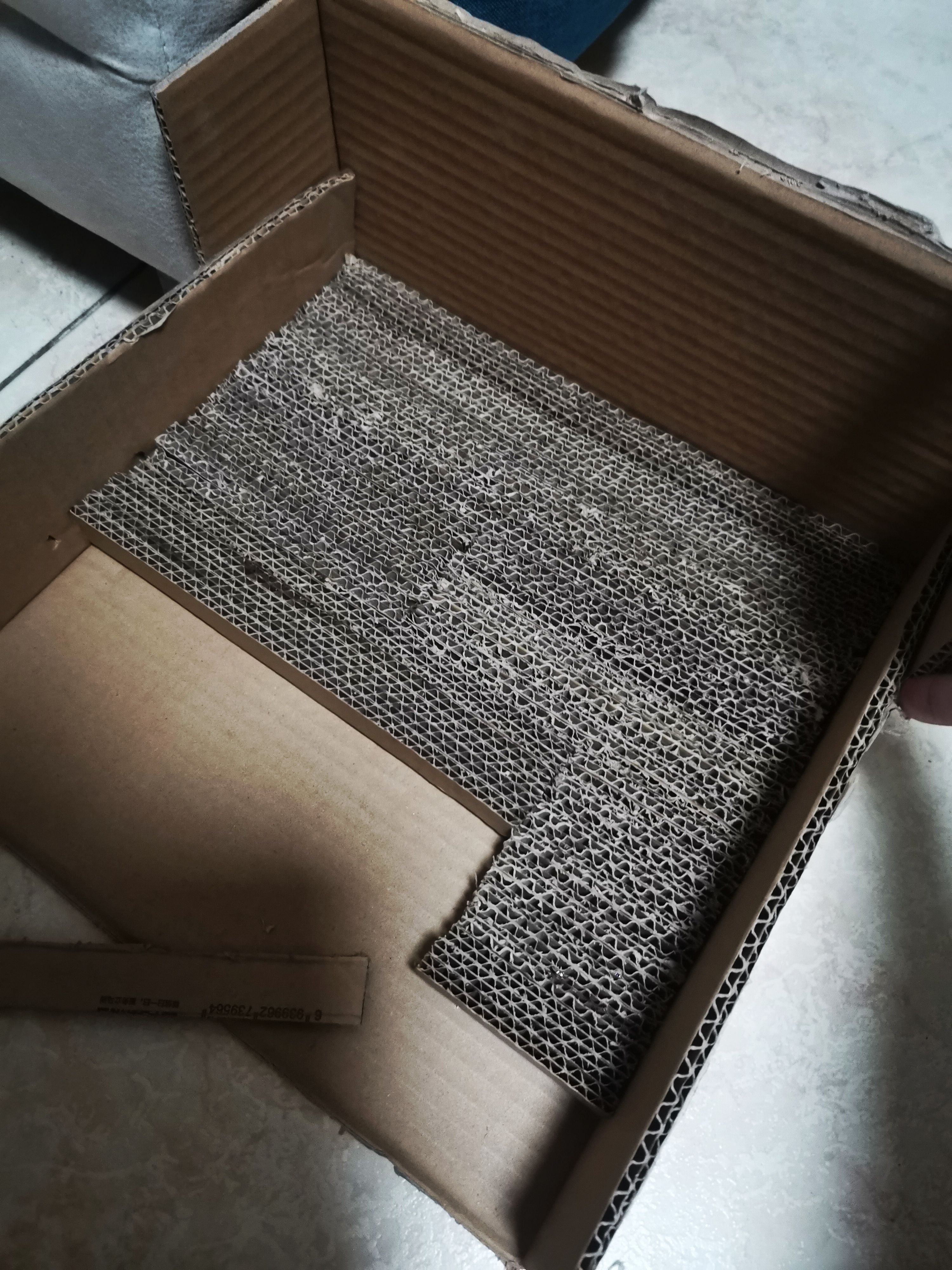 📦 准备不要的快递箱,看好尺寸裁成条。不要顺着纹路裁(裁完后横截面有好多孔✓)粘一起,粘成一块儿猫抓板做底座
