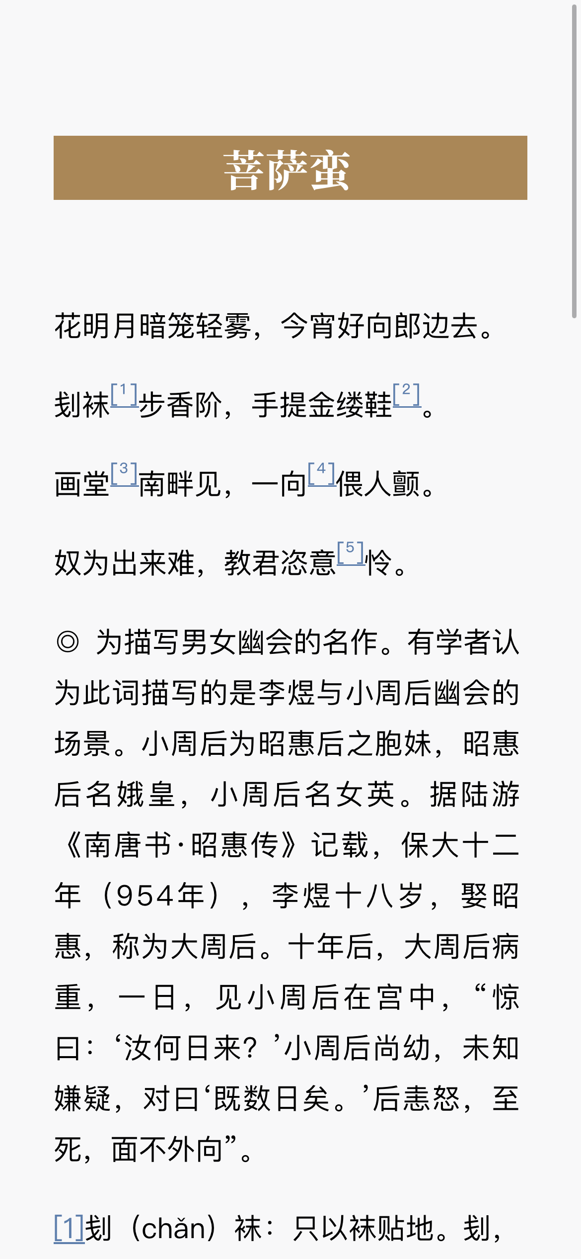 这两天看李煜的词还有点奇怪,为什么这位一国之君,居然能写出“刬袜步香阶,手提金缕鞋。…奴为出来难,教君恣意怜”的幽会情词来,君王怎么尝得到爱而不得的苦!今天略一翻找,原来是在写老婆病重之际和人家妹妹夜间幽会的场景啊。。