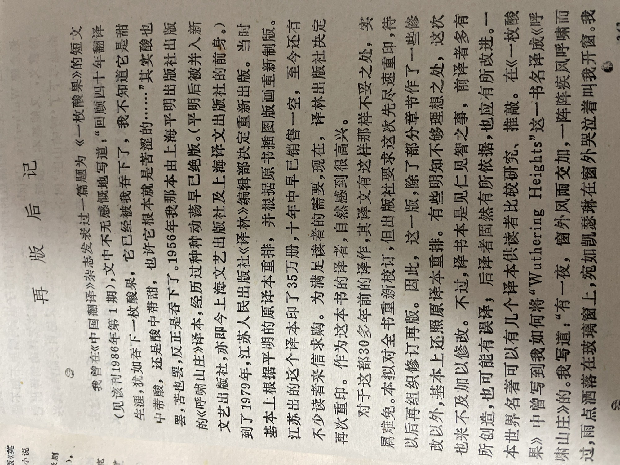再版后记译者杨苡曾写到如何将“Wuthering Heights”这一书名译成《呼啸山庄»的。“有一夜,窗外风雨交加,一阵阵疾风呼啸而过,雨点洒落在我玻璃窗上,宛如凯瑟琳在窗外哭泣着叫我开窗。我所住的房子外面本来就是一片荒凉的花园,这时我几乎感到我也是在当年约克郡旷野附近的那所古老的房子里。我嘴里不知不觉地念着 Wuthering Heights ……苦苦地想着该怎祥确切译出它的意义,又能基本上接近它的读音……忽然灵感自天而降,我兴奋地写下了‘呼啸山庄’四个大字!〞那时是1954年初的早春2月。
