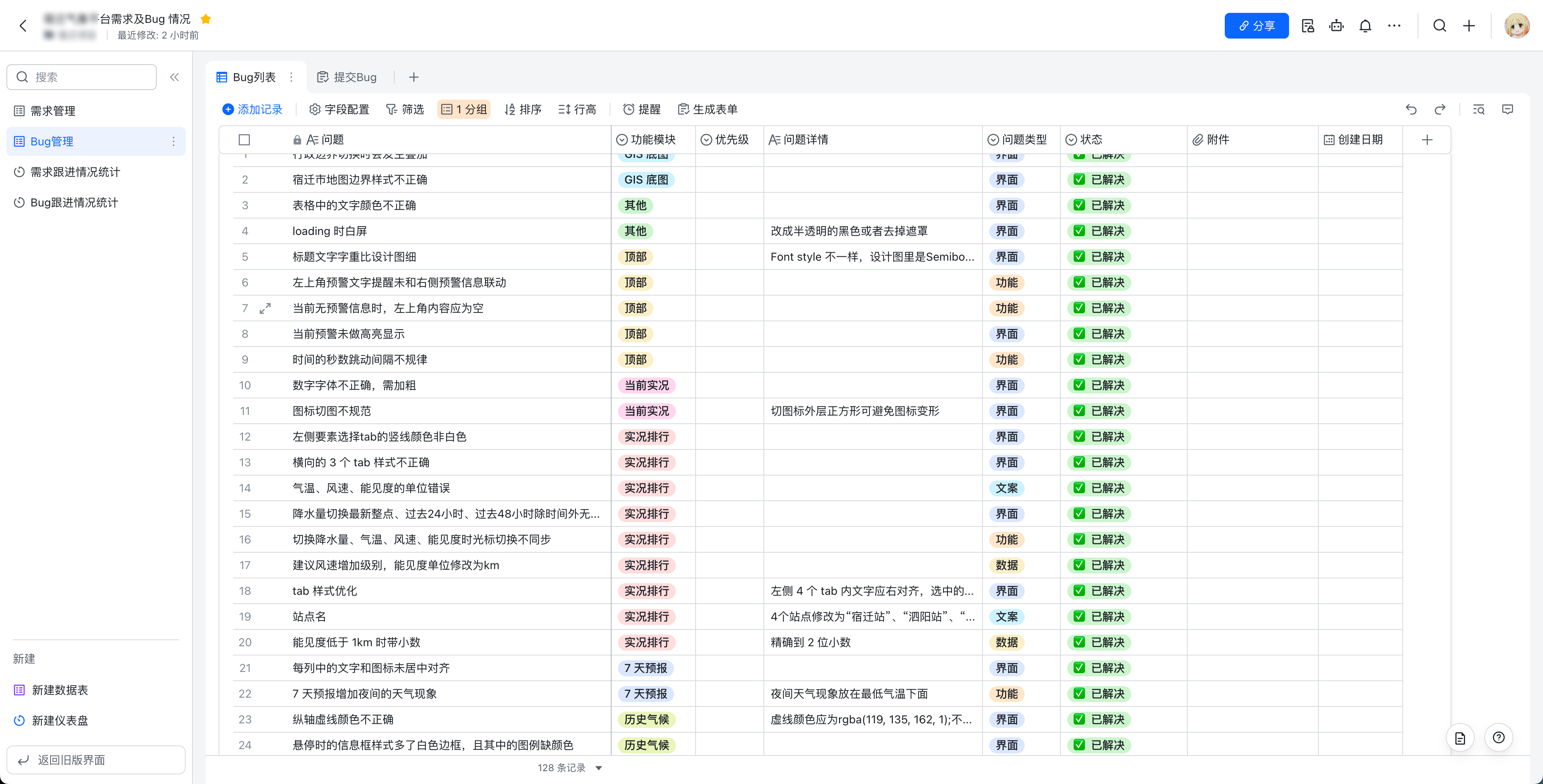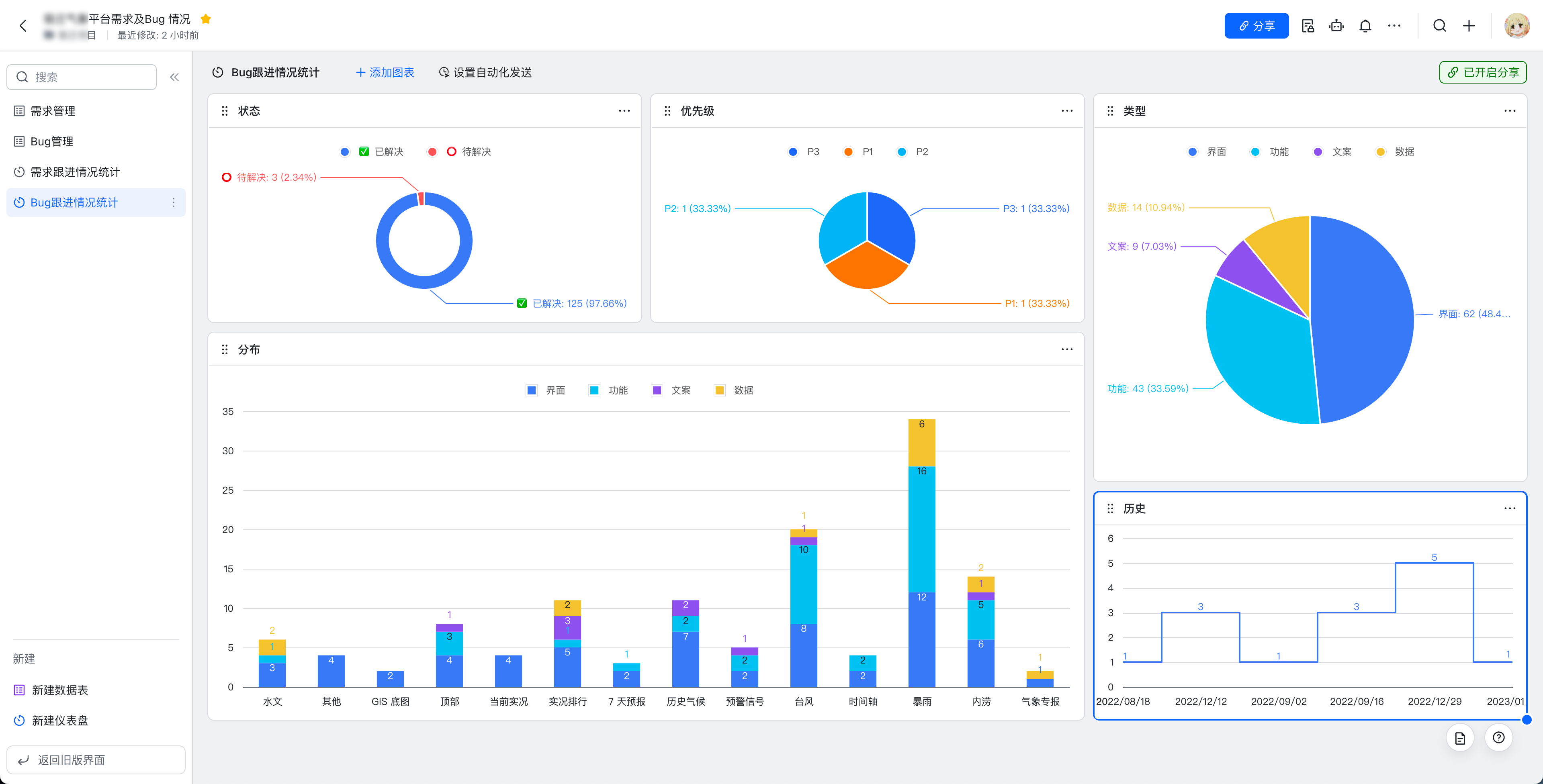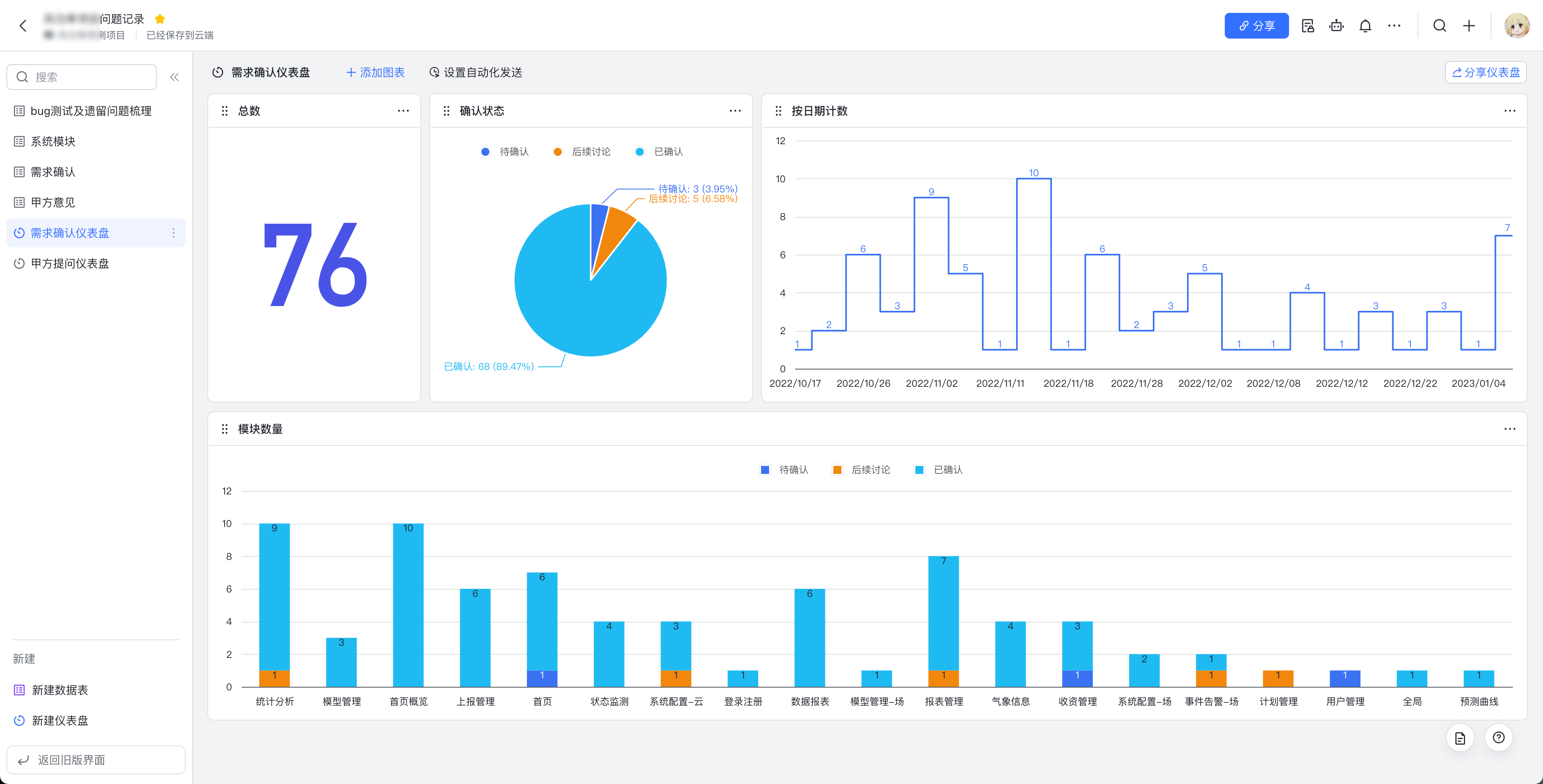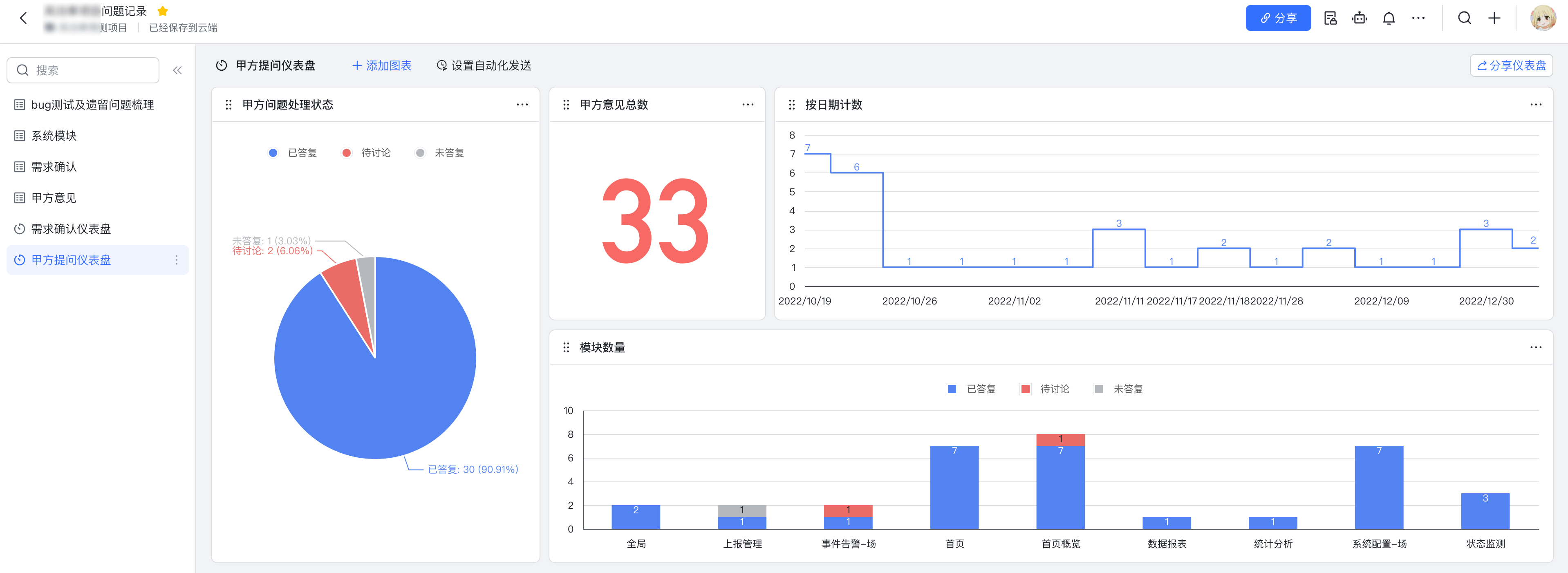飞书多维表格做bug检查、需求记录、甲方意见,然后自定义配置输出为这种图表,真方便。