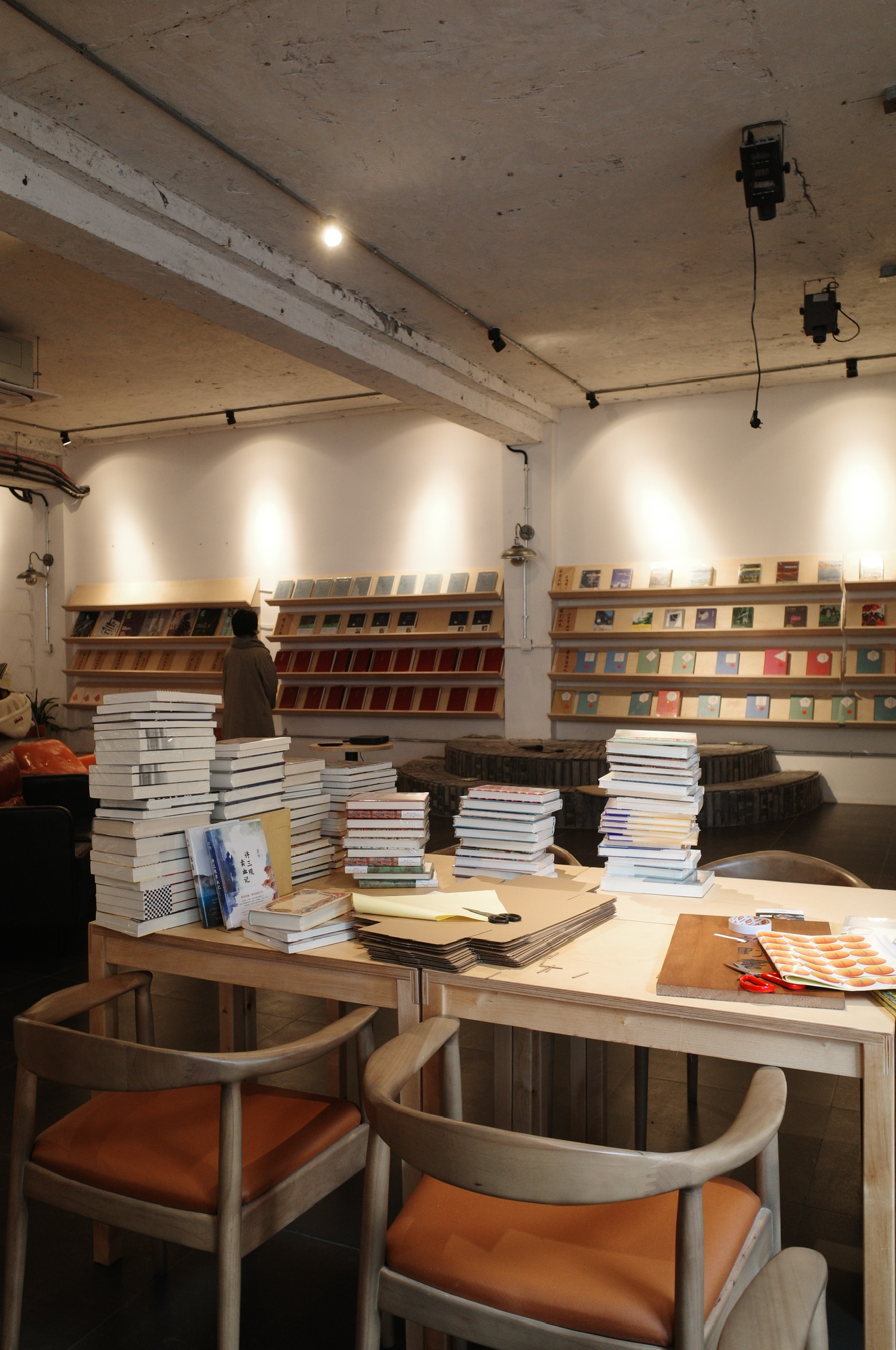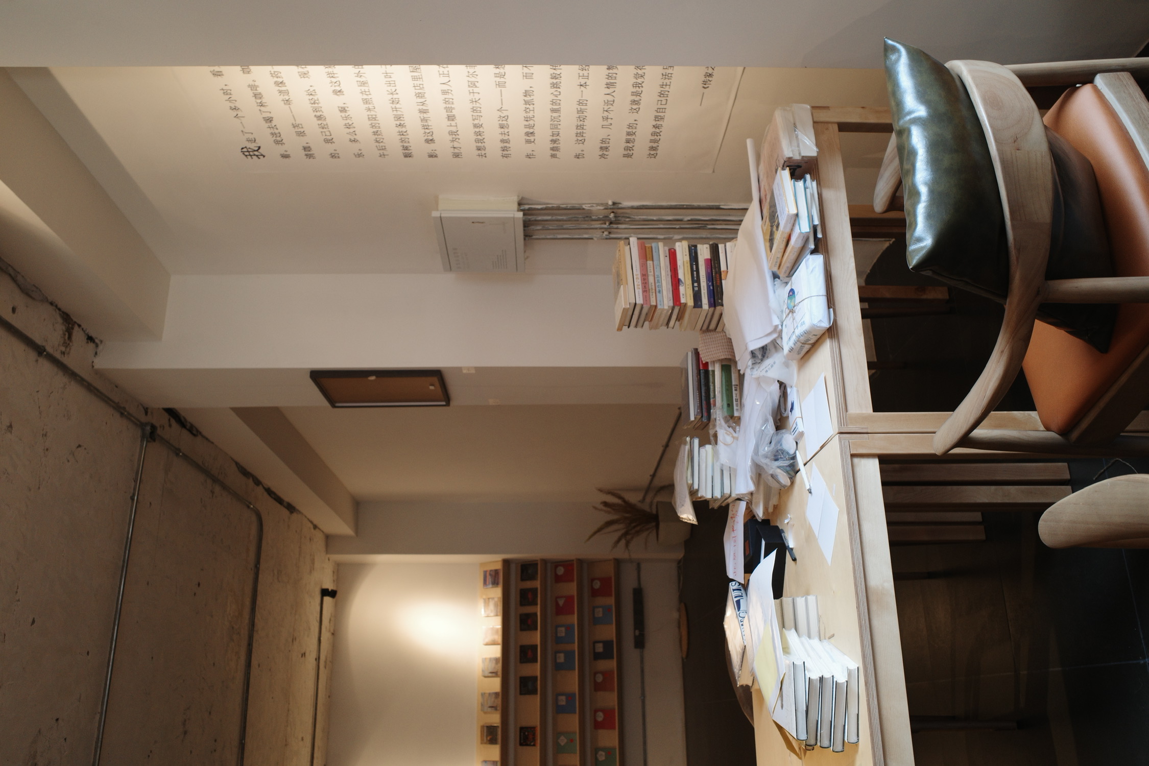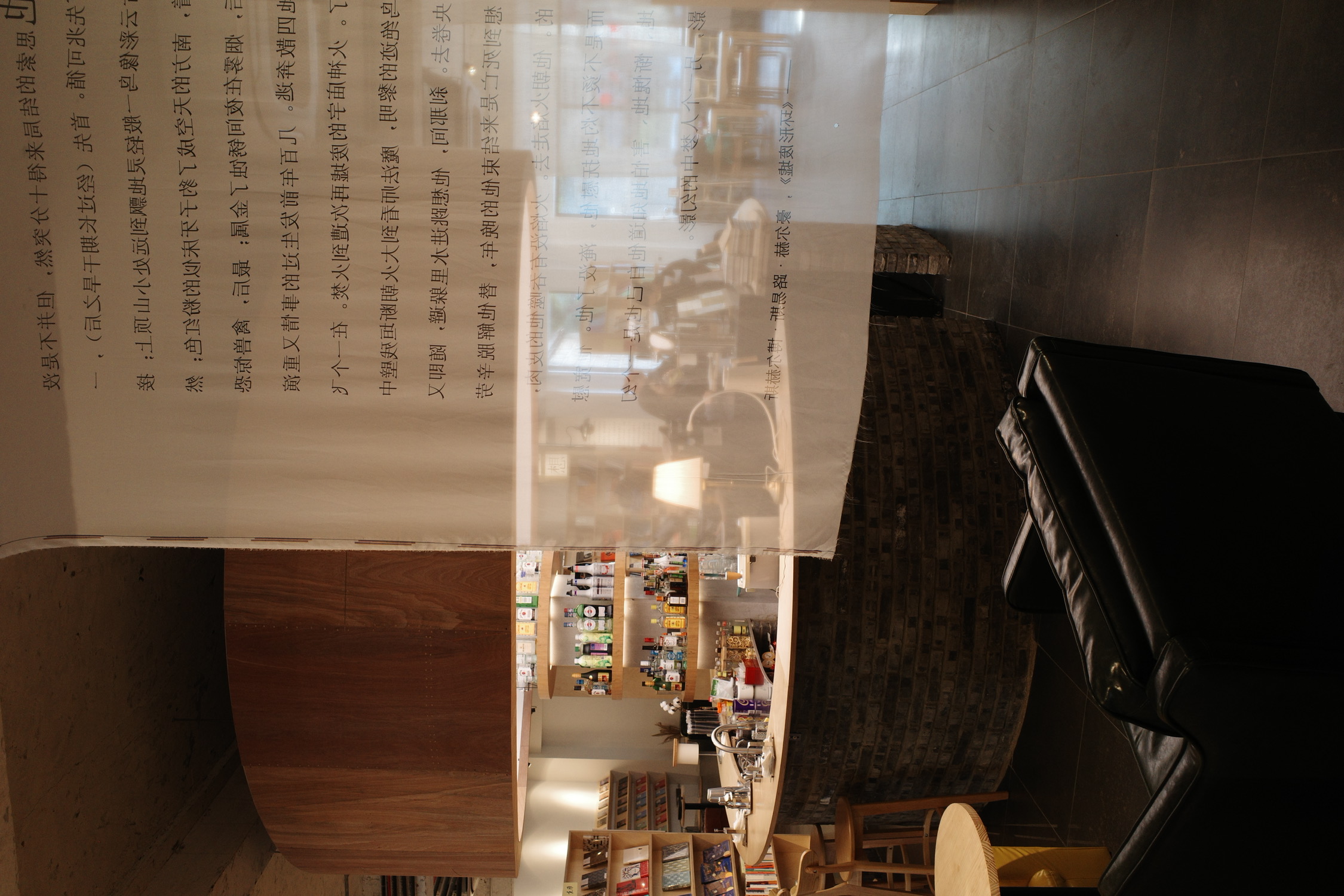 先是书籍,二浮的书籍只有小说。书籍陈设的位置正好将偌大的空间划分成小空间但又保持了开阔,小空间里提供桌椅以供阅读(也有人自习)。加上摘抄小说段落的布帘,坐着看书也不会被打扰。浏览一圈下来,讲真,大部分小说都没有读过。大部分都有试读,也可以借阅。小说的好处大概就是不会拒人千里之外,看到,拿起,翻几页,不妨读读。
