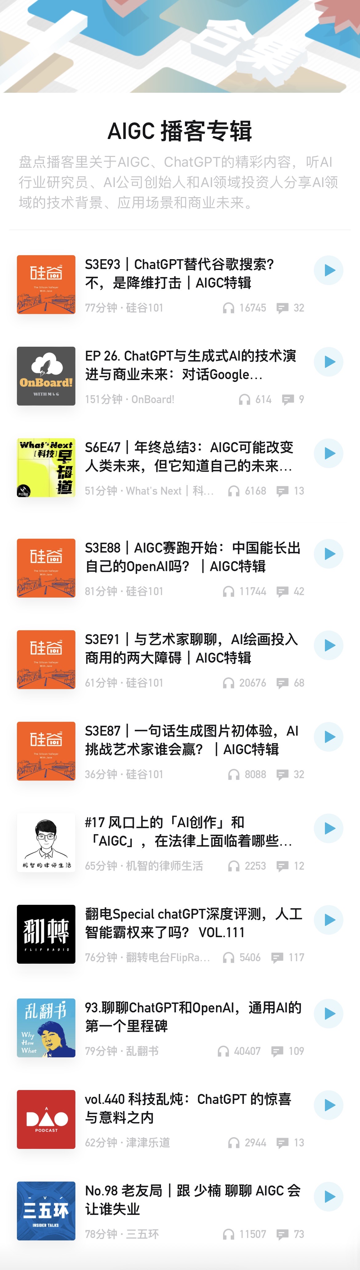 最近AI技术、ChatGPT的探讨很热烈,给大家推荐播客里的一线从业者分享,来自AI行业研究员、AI前沿公司创始人和AI领域投资人。
