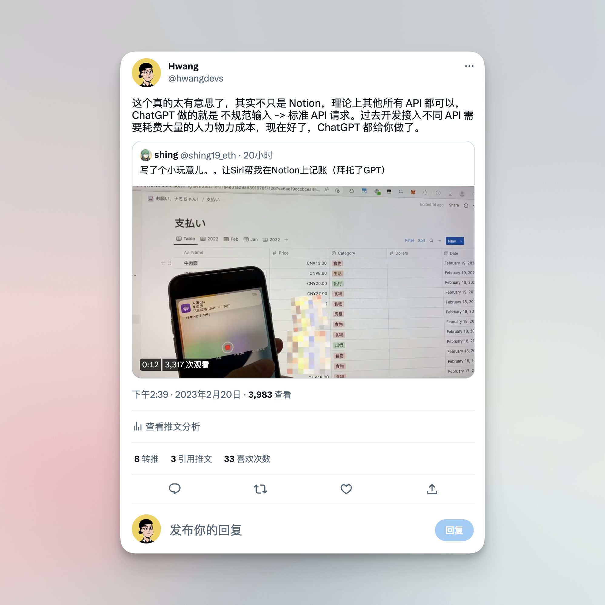 今天在推上看到了一位博主做的 ChatGPT 记账应用。
