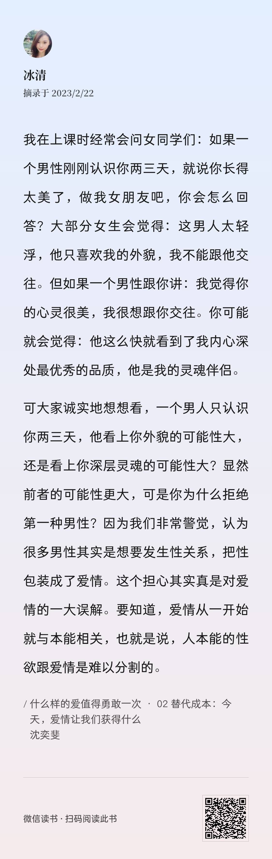 纯爱比爱欲高尚,爱我的灵魂比爱我的身体更纯粹,一直有着这样的信念的我在读完这本书后,更加能正视自己的性吸引力,以及在亲密关系中的欲望问题:性更多的是一个脑部运动,而不是一个单纯的生理反应,爱作为一种给予的力量在性方面也是有所呈现的。