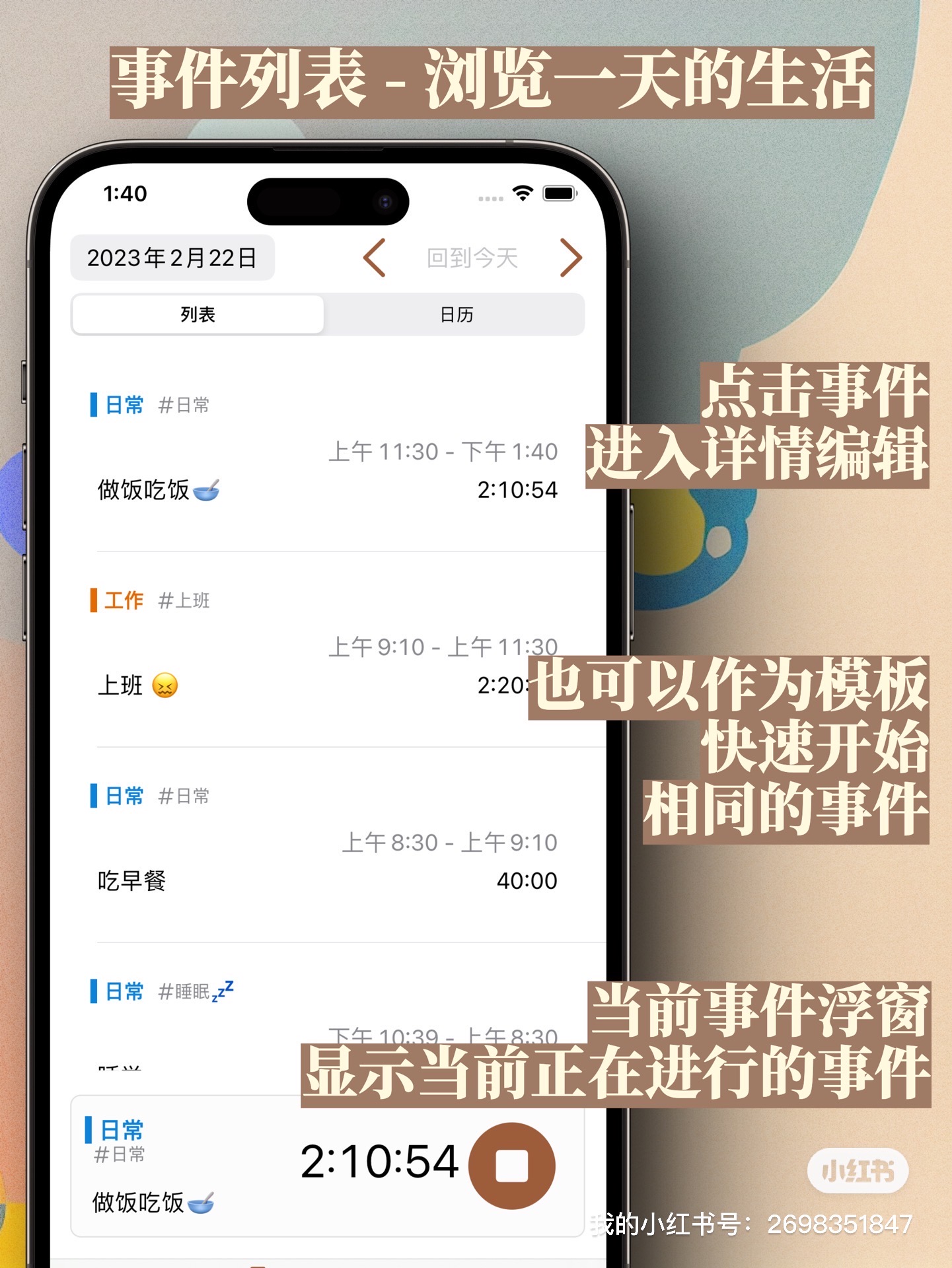 年轮提供一个方便快捷的模板界面语小组件,一键即可开始记录生活,让你能够随时随地记录生活中的点滴。你可以记录每一个事件的标签和说明,让你更好地分类和统计。