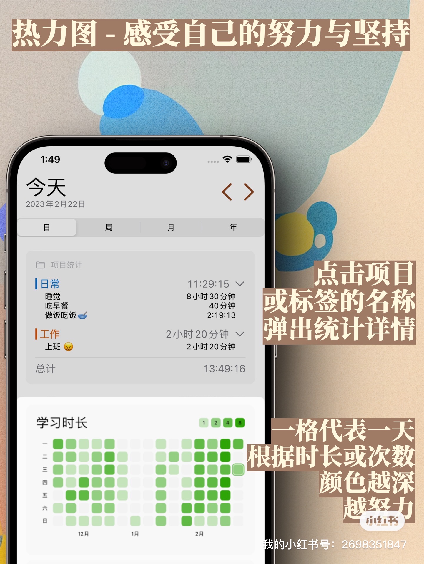 年轮提供了一个强大的统计功能,让你可以更好地进行周期回顾,了解自己做了哪些事情。并且通过热力图功能,你可以更直观的了解自己某件事情的执行情况,感受自己长期范围的真实效率与状态,从而更好地调整未来的计划,改善自己的生活。