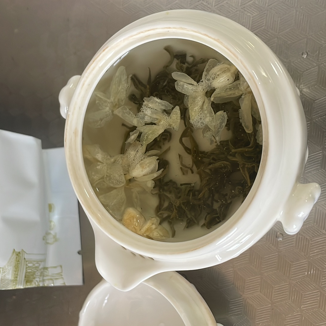 吴裕泰1200/斤的茉莉花茶有花瓣,泡开很舒展。据老板说是店里唯一一款夹杂花瓣的茶叶,所以叫飘雪。