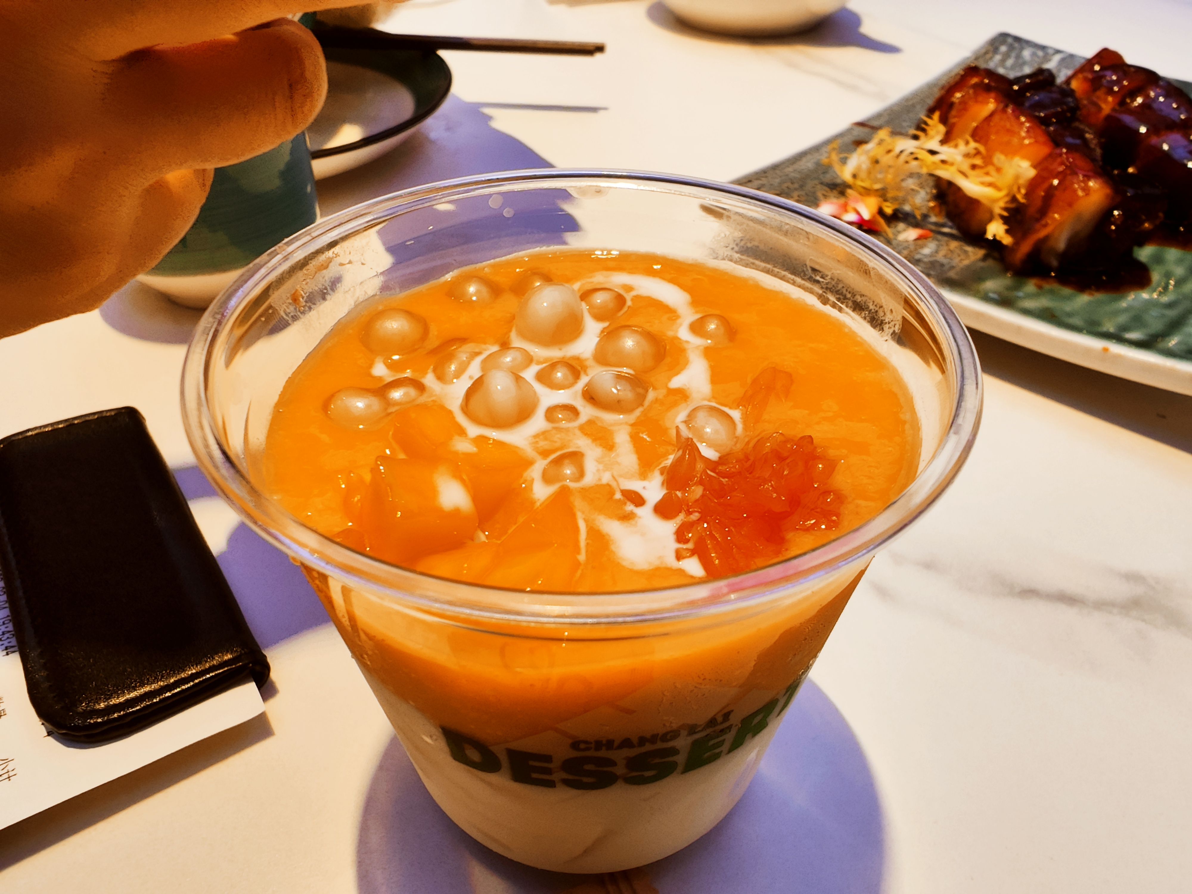 是比较好吃的,上面是杨枝甘露(芒果+西柚果肉+爆珠),下面双层椰奶冻。吃起来Q弹的糯糯口感,是每桌都会点的甜品。