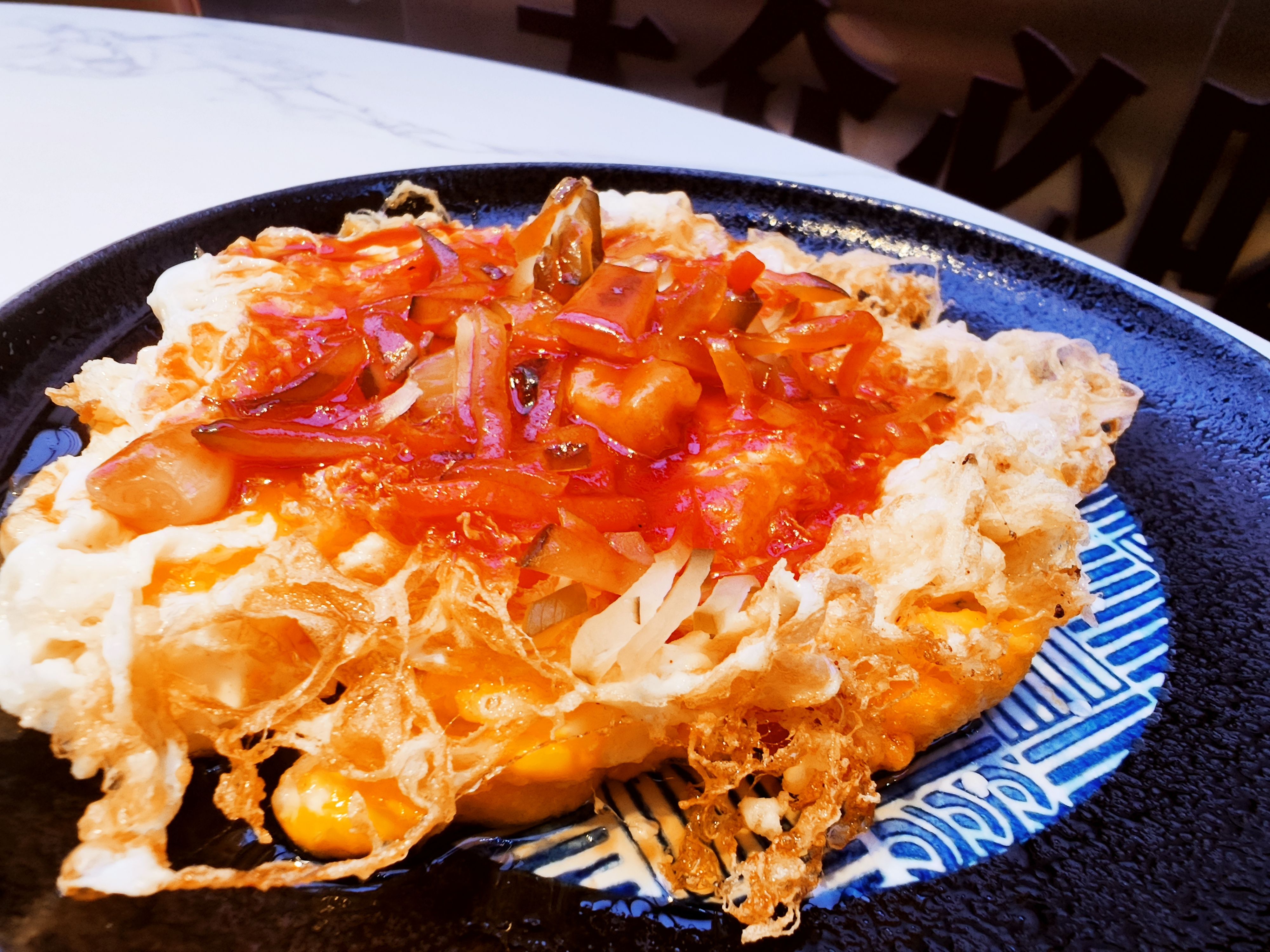 经典旧式粤菜家常菜,炸蛋是一整块的,外面焦脆里面松软,还是溏心的蛋,证明炸时火候控制不错,而五柳汁酸甜比例适中,但量略少一些。