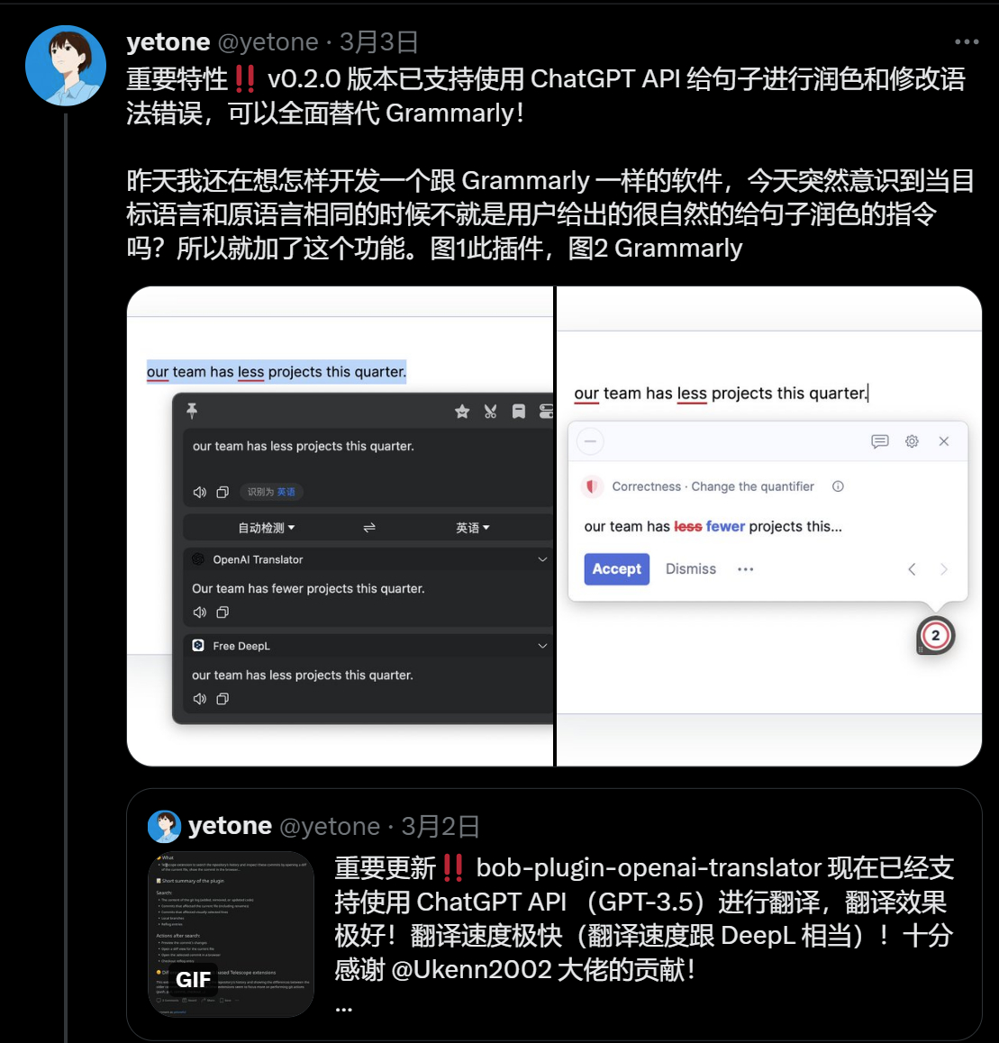 另外,开发者之前还出过 DeepL 版本的插件(但似乎已经没必要了?)