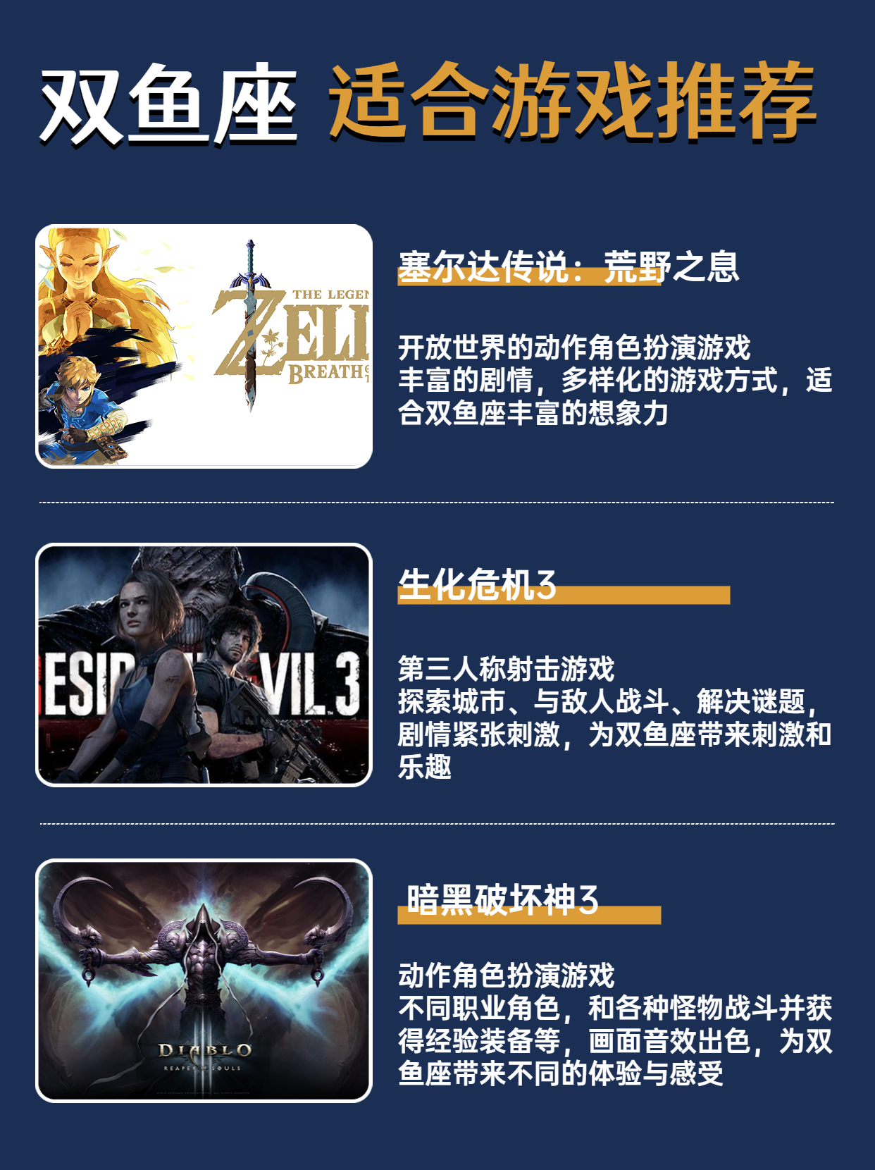 1.《塞尔达传说:荒野之息》:这是一款开放世界的动作角色扮演游戏,玩家可以探索广阔的世界、解决各种谜题、与NPC互动等等。游戏中有着丰富的剧情和多样化的游戏方式,双鱼座的人会很容易沉浸其中。