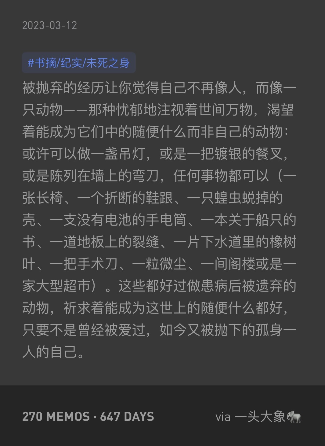 我把所有她描述这一切的词语记录下来,我希望提前感知这些痛苦,好让当有一天我不得不也要去面对这一切的时候,能够在脑海中翻腾出几句话,替我表达自己的感受。