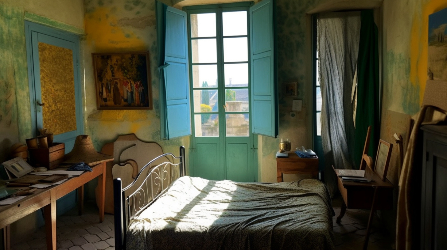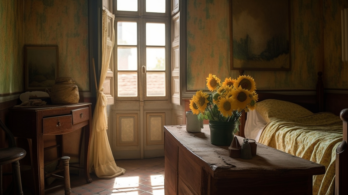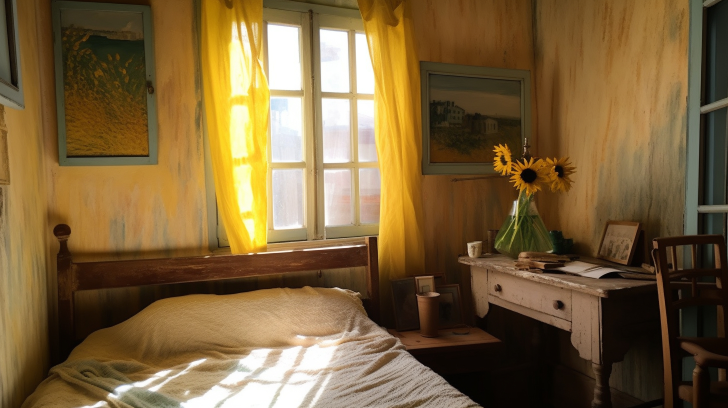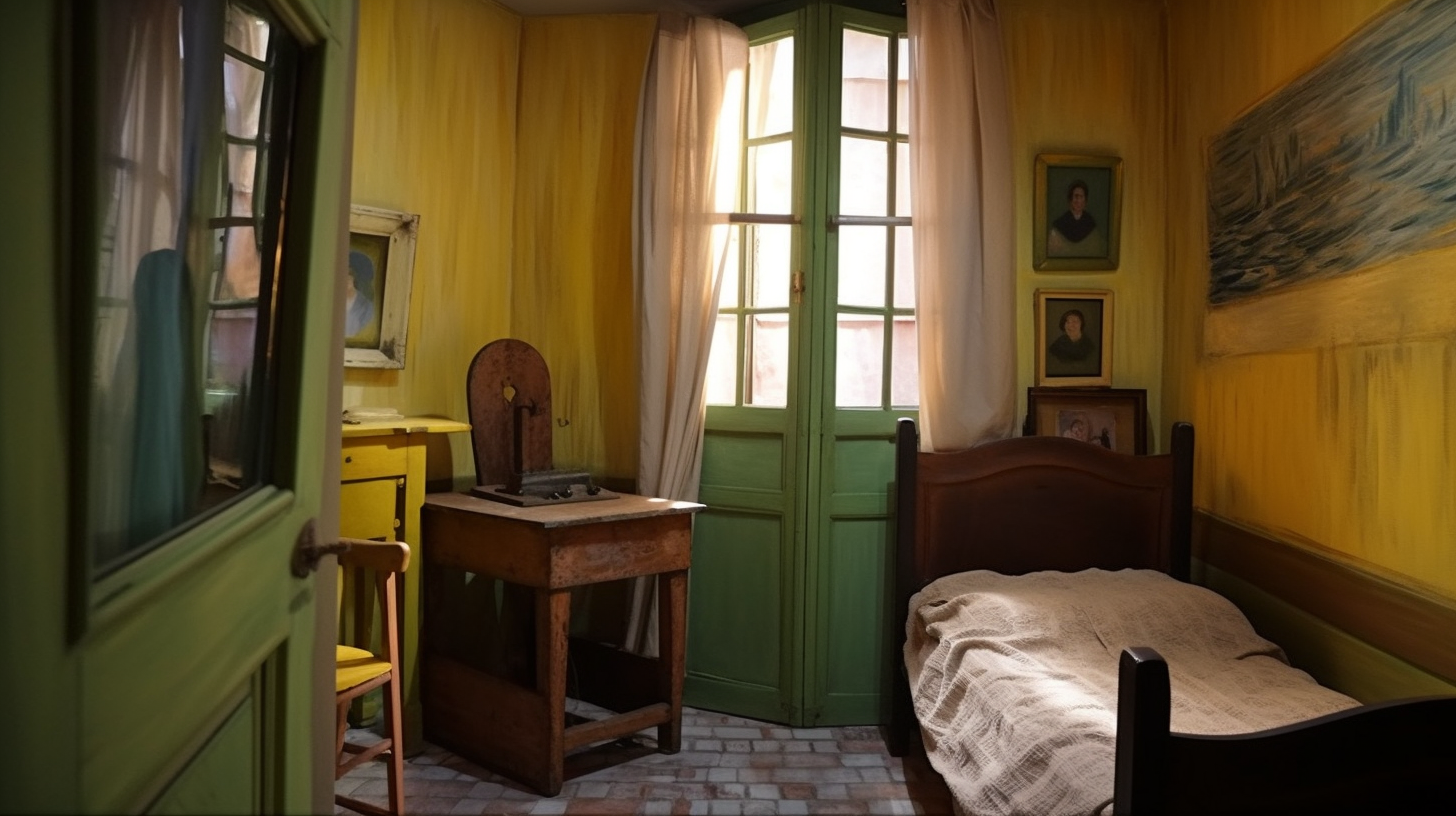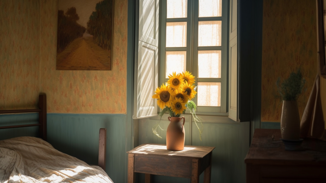 听说 Midjourney v5 的写实效果不错,于是试着让它给梵高的房间拍个照。