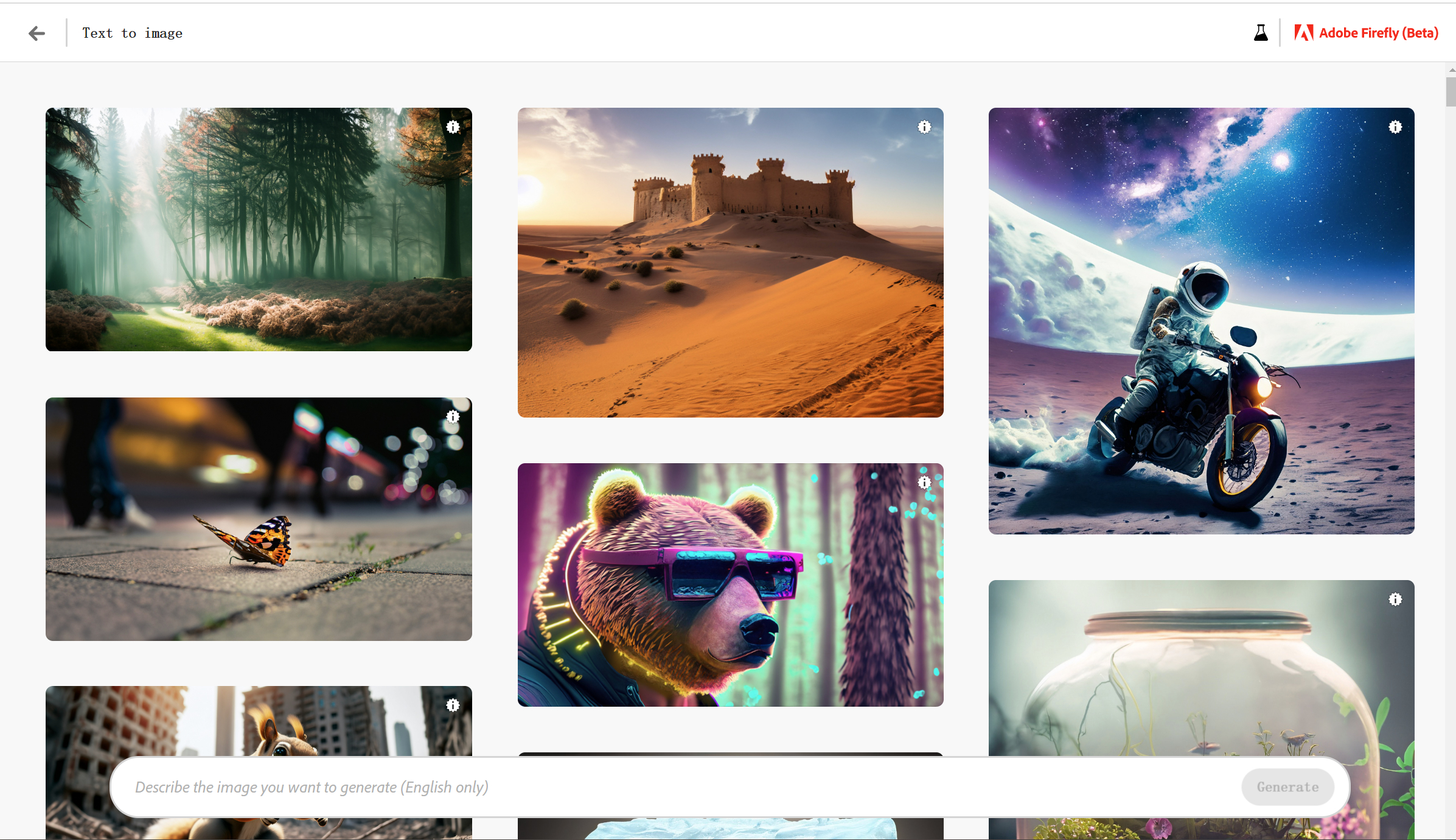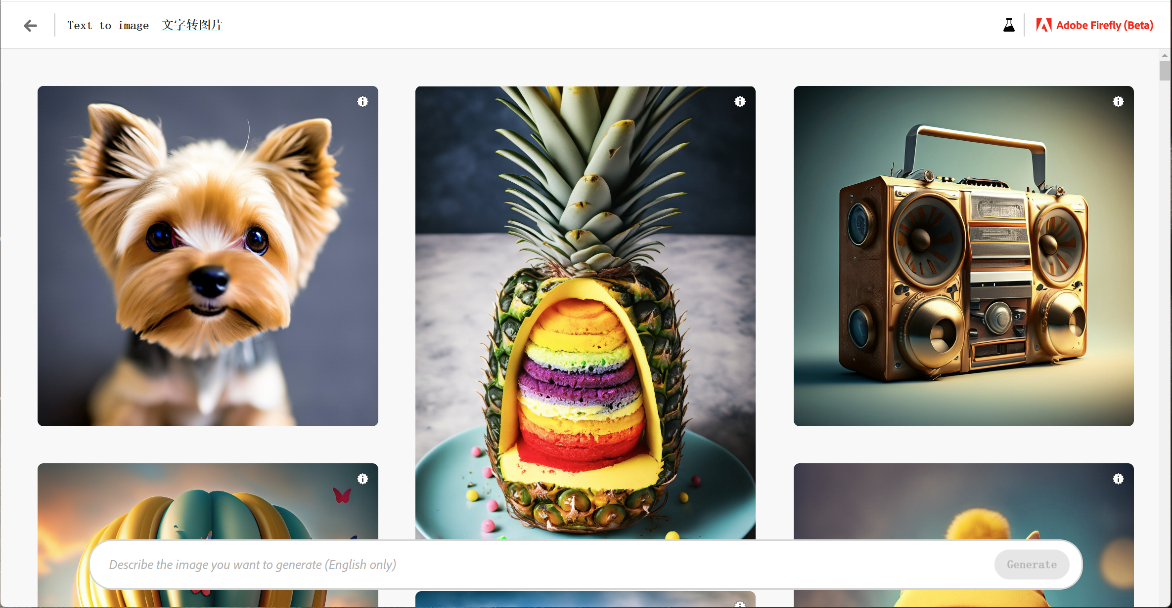 会陆续在这条更新 Adobe Firefly 的测评,目前只开放了图1的两个版块,宣传视频里的80%的功能还没开放。