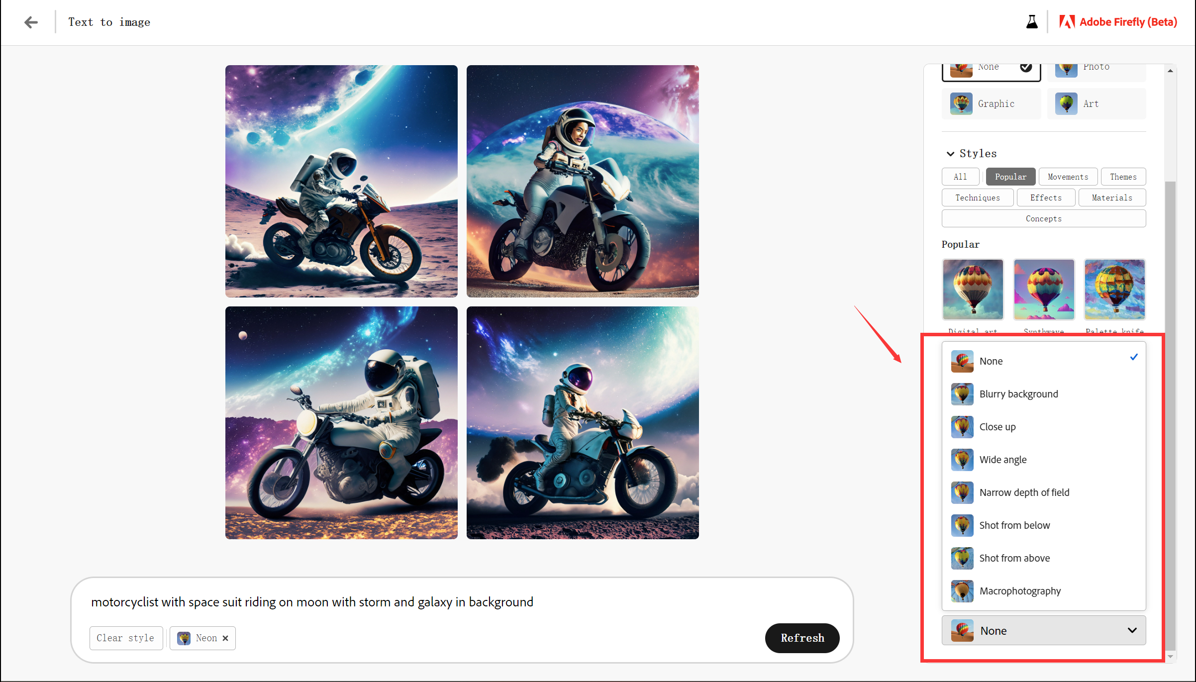至于早就看疲了的文生图嘛,不是很想测了,大家看示例图片就够。生成质量大概是 MJ v3~v4 之间的水平,参数设置就是把镜头语言、打光、色调等关键词做成面板,懂的都懂。(见图5~7)
