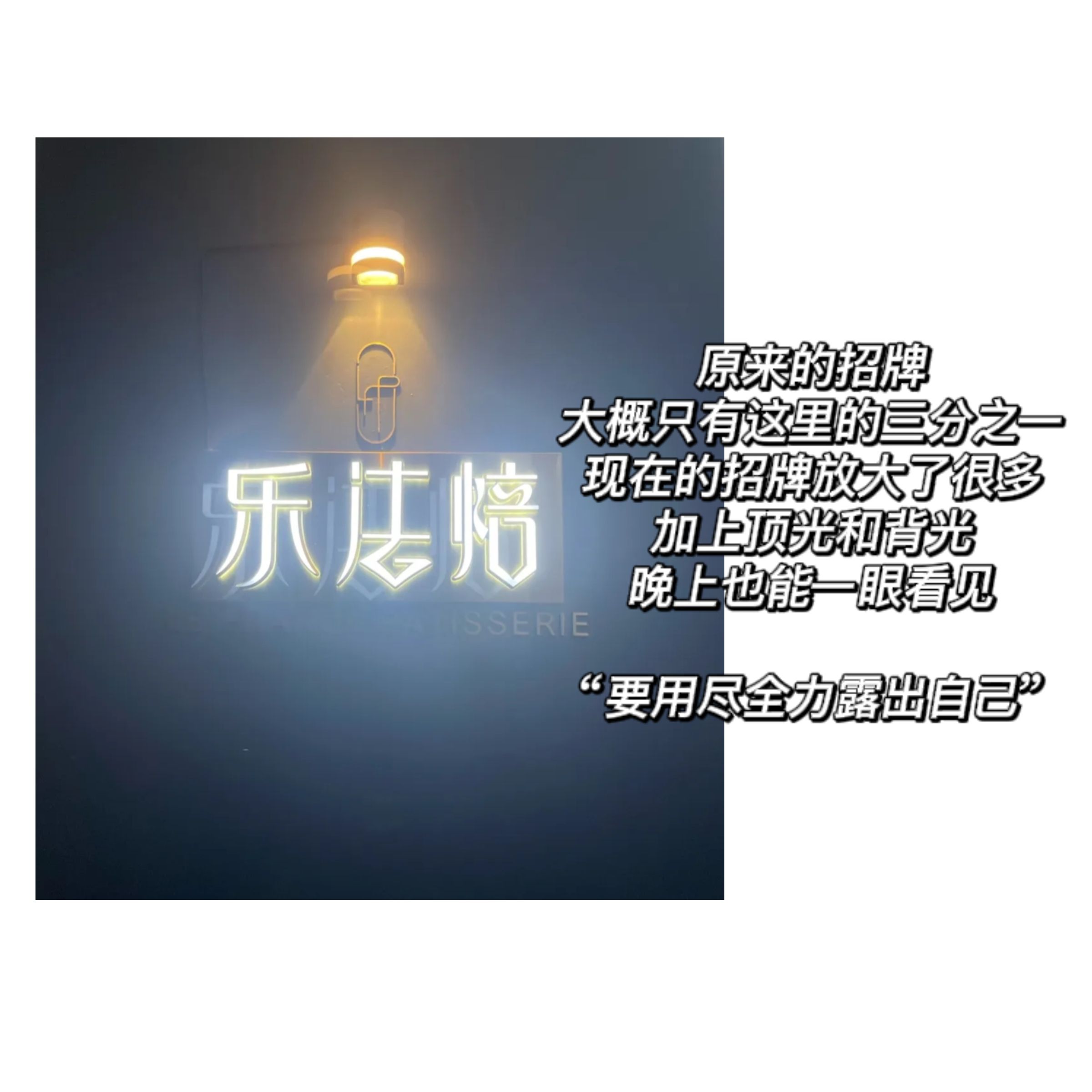 我很喜欢这家店,很美好,美好的滤镜之一是园区一个IT离职后,去法国蓝带学习回来后创业做的,所以它一开始招牌很小,大量留白,门店看上去很美,不过其实不太符合经营逻辑;后面我看它把招牌改大了,加了背光(图二),打心底里开心,因为它更容易被看见了;小生意不要太迷信自己能爆火,要用尽全力露出自己。