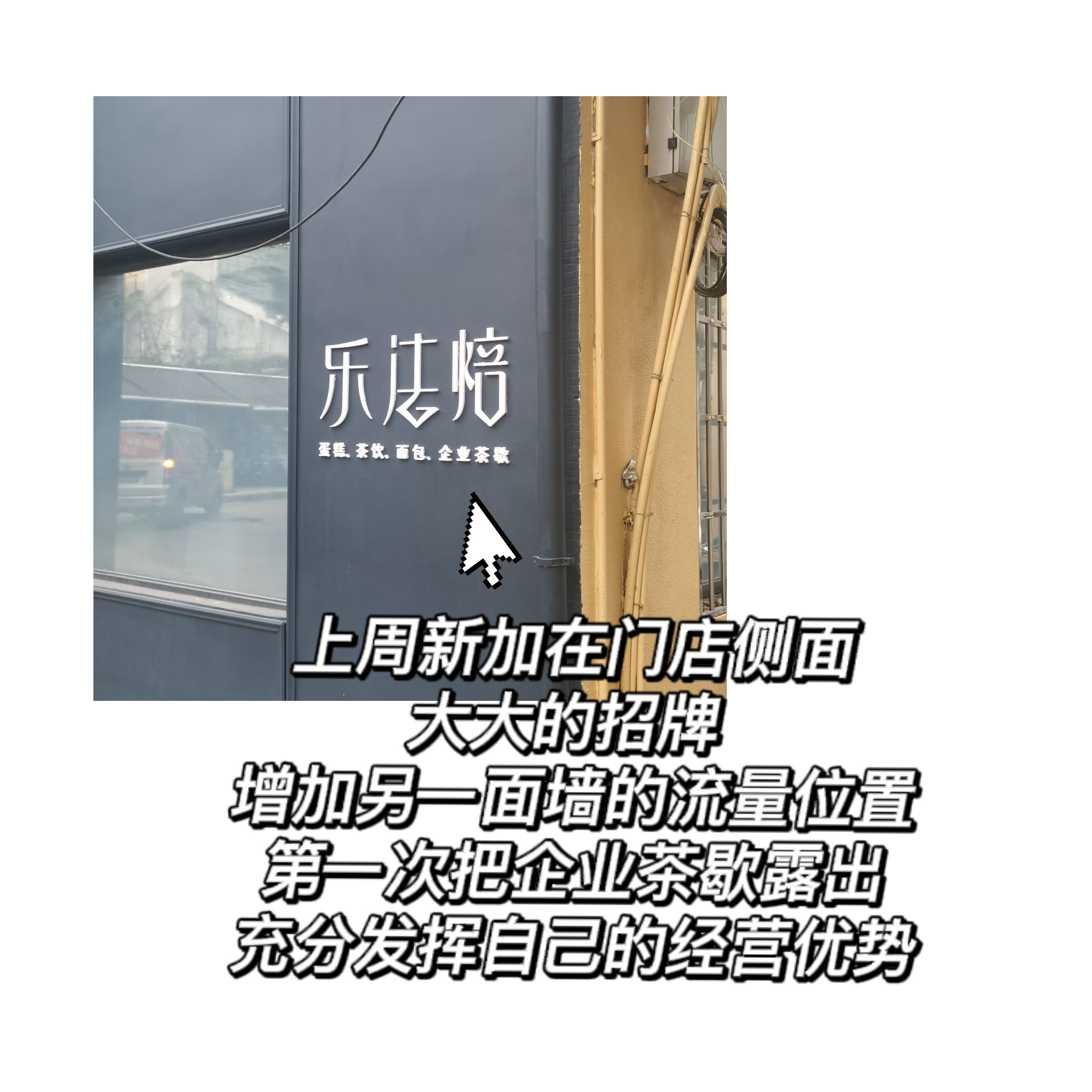 这家店是我们办公园区的一家烘焙小店,我在去年小马宋营销训练营的面试题里分析过它,那时候建议里面有两条,一个是招牌改大加灯,另一个是注重企划部分露出(图一)。