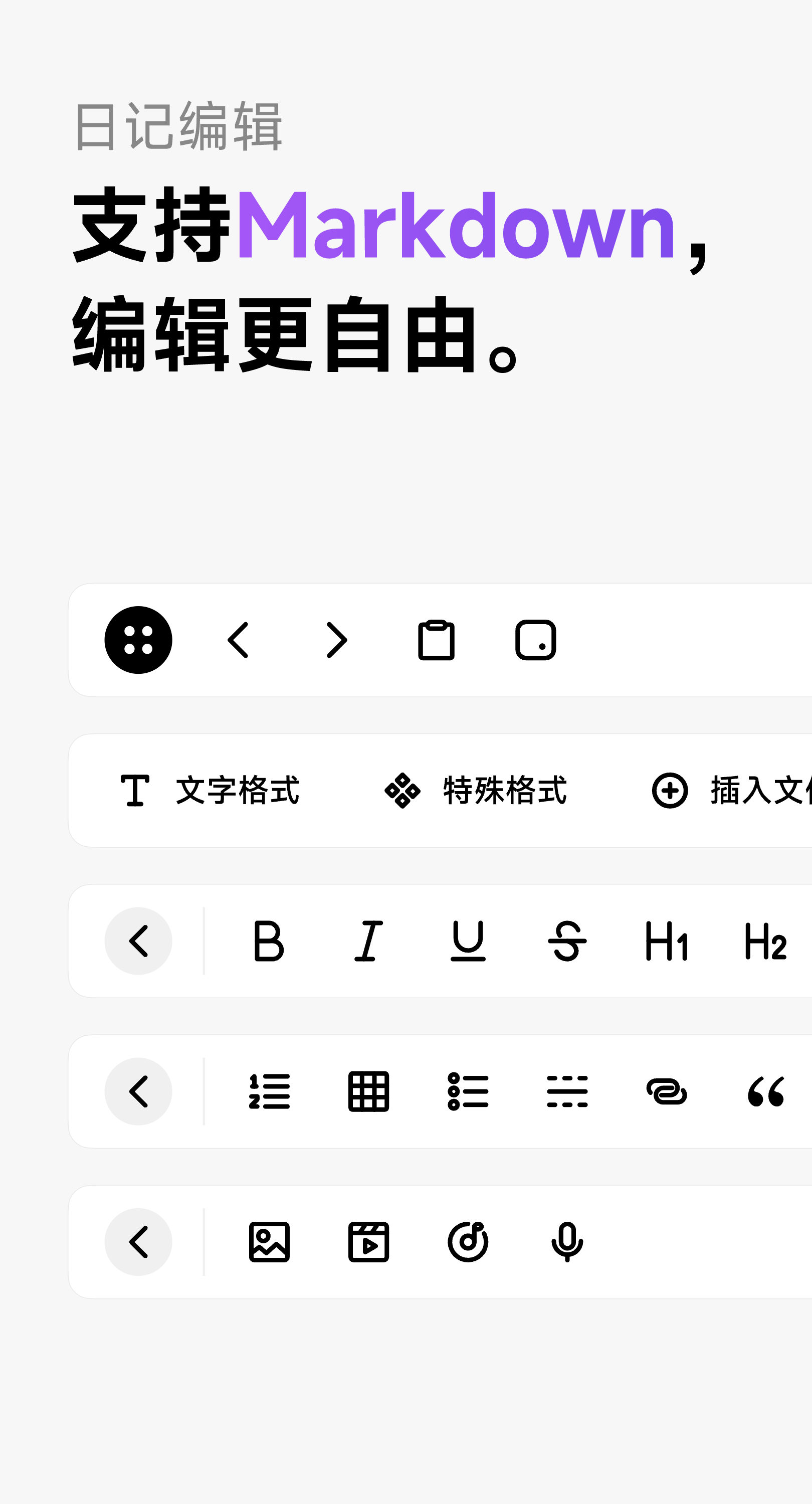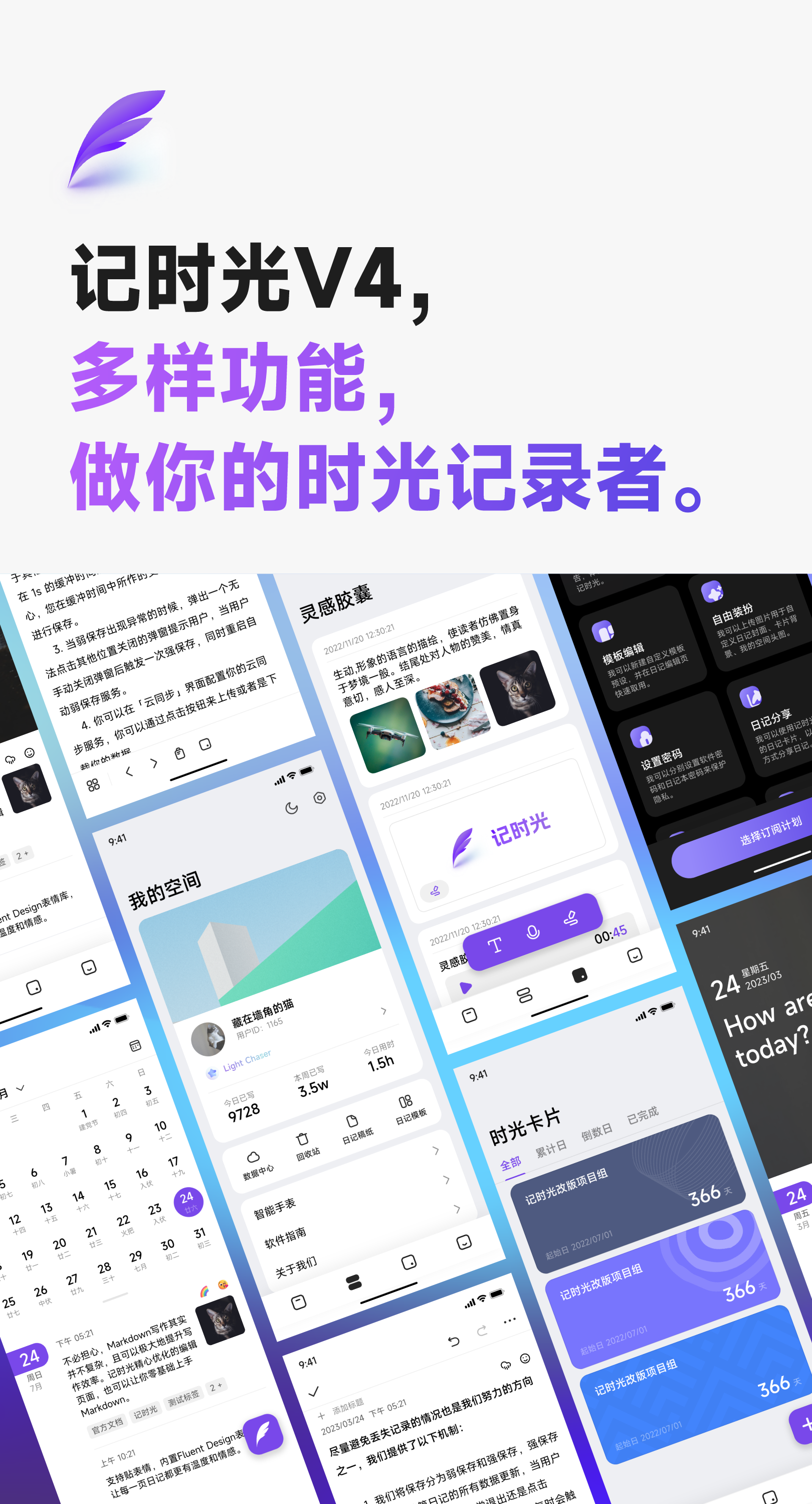 记时光拥有传统日记无法实现的功能,如插入图片,插入音视频,甚至插入网页,但这还不够。我们根据传统日记功能精心设计了布局,并尽力优化更优雅的日记体验: