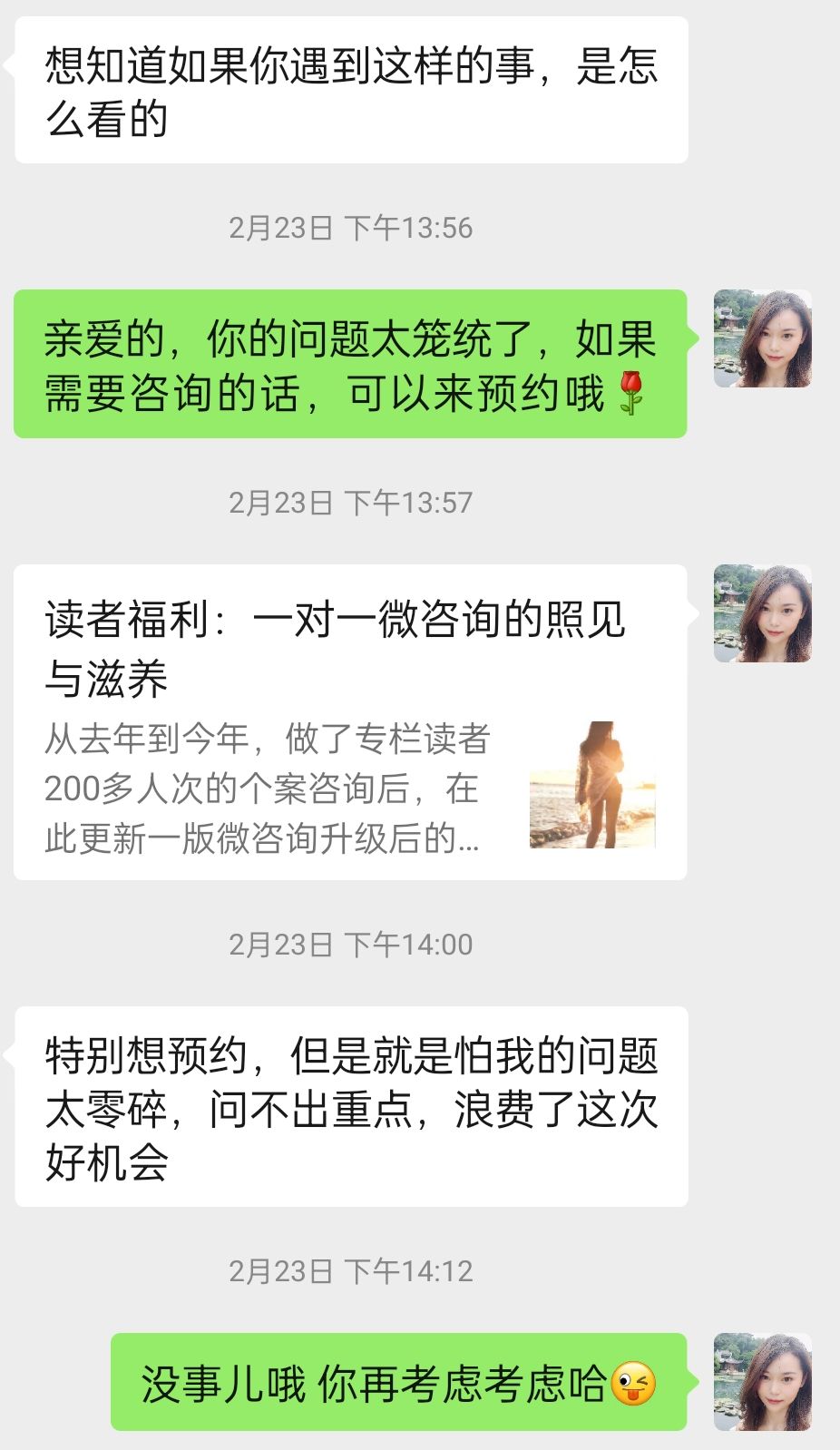 2)如果是个人的问题,我发给对方我的咨询海报和专栏,让对方「看一下」「如果有需要可以购买/预约」。