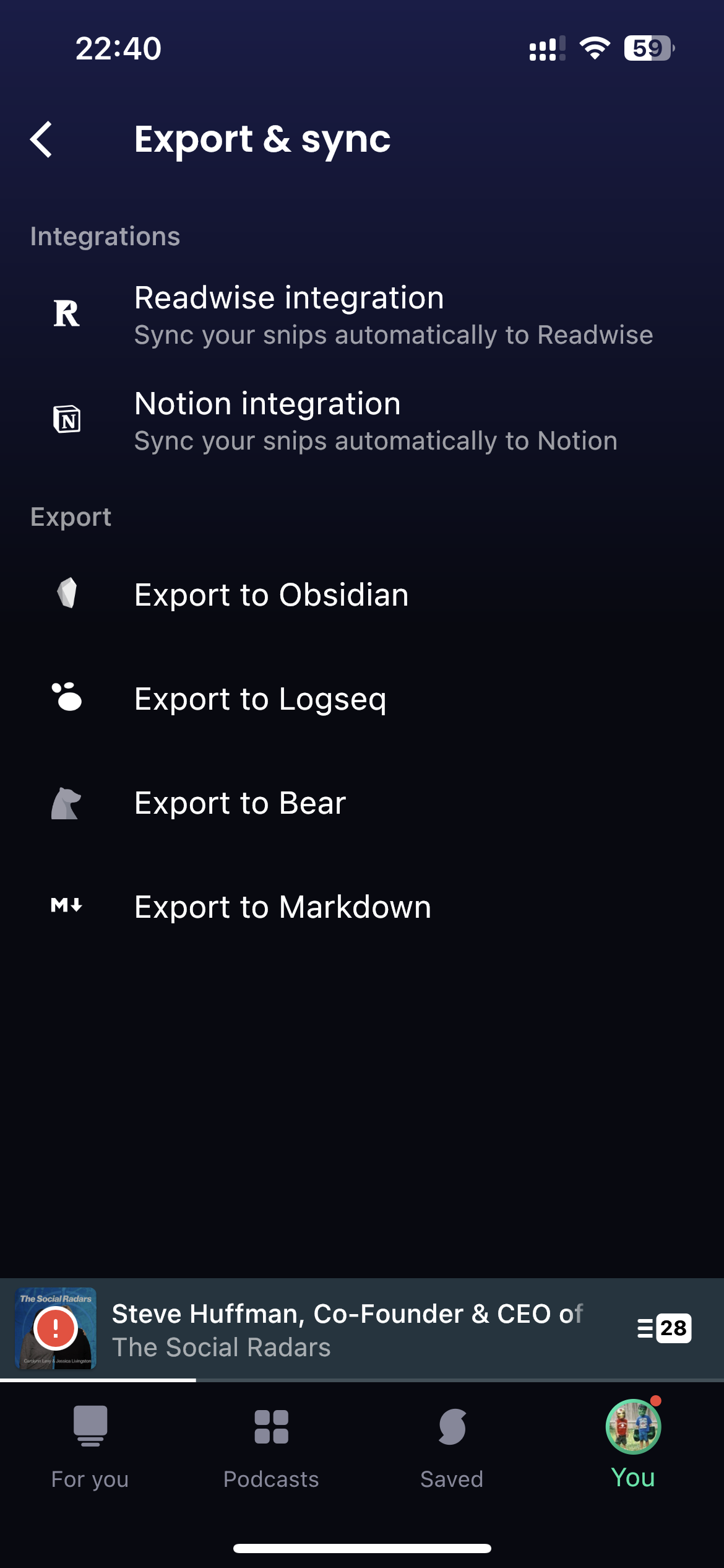 最棒的是,snipd还提供了自动同步到notion、Obsidian、readwise等软件的功能,播客知识点和文字也可以非常容易地汇总到你的笔记。