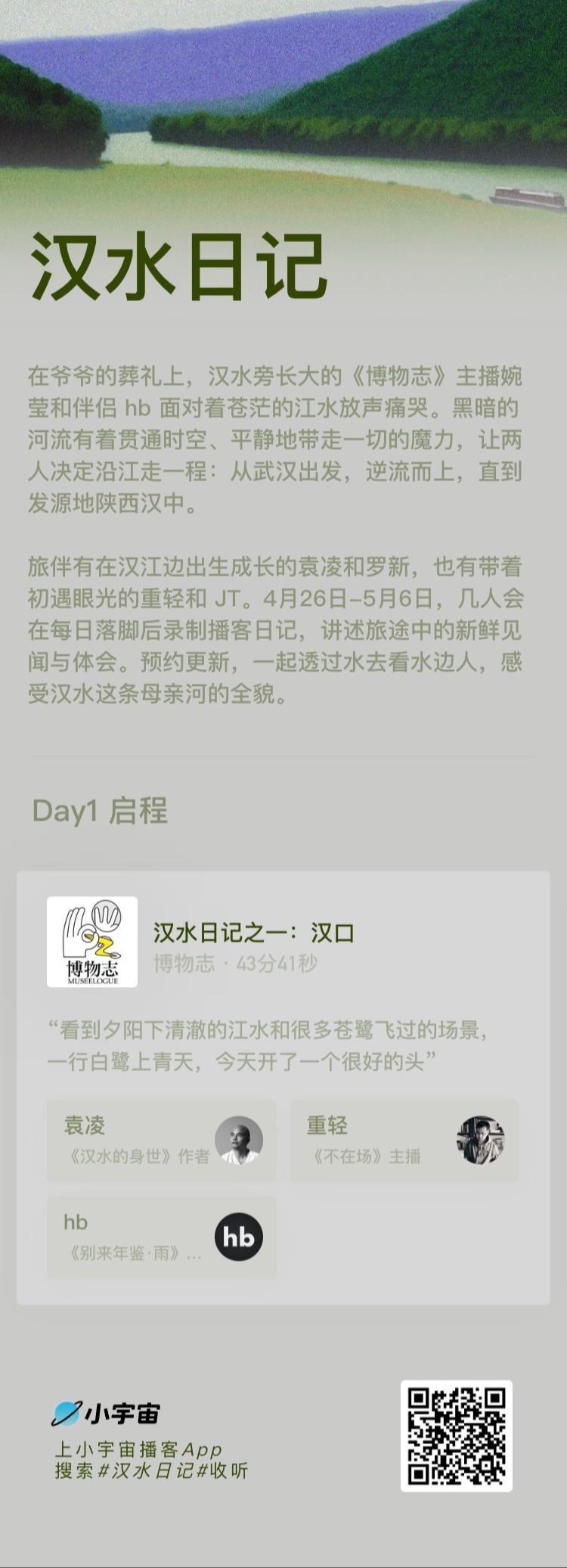 TA们会在每天落脚后录制播客日记,讲述旅途中的新鲜见闻和体会,你可以点击小宇宙的专题页预约他们的每日更新。也许,你未曾了解过这条河流,但不妨把这个系列节目作为你和它的初次相遇,去感受这条和我们每个人相关的汉水的全貌。