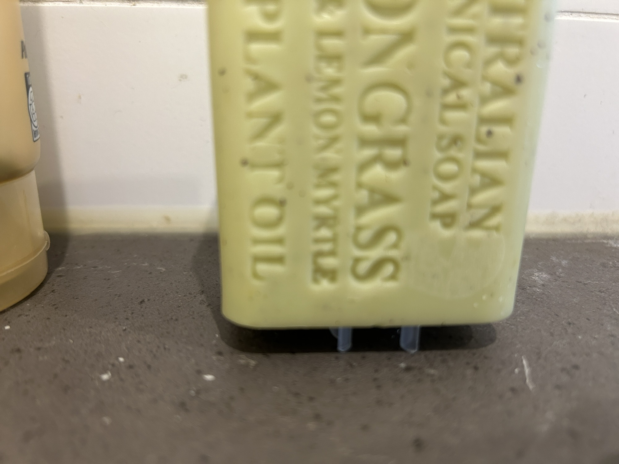 本来看大家搞个瓶盖放着挺好,但正巧早上我刚把我所有瓶子给扔了,我恨!我就只能找到个卡化妆品的这玩意儿,我就想着能不能也插里立着,结果太小了立不住。我就干脆把它躺平立着了。就…也很好诶!不接触台子,可以沥水,还免费,用的时候他还是一块完整的香皂!