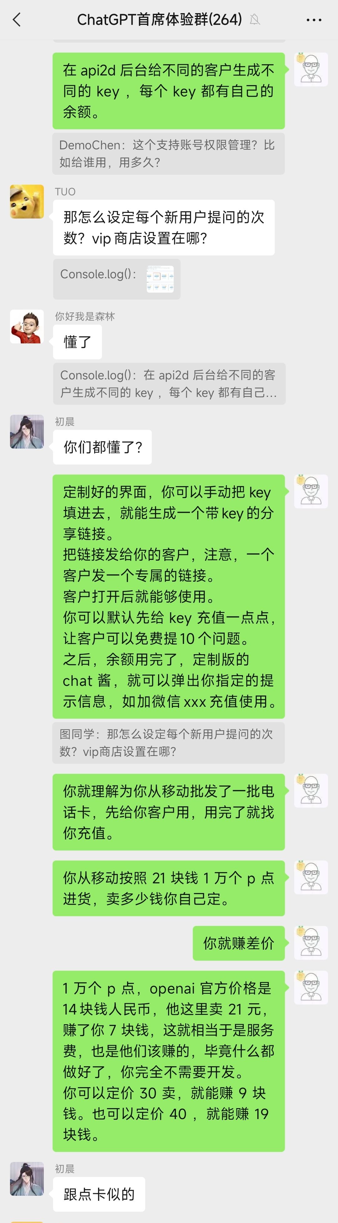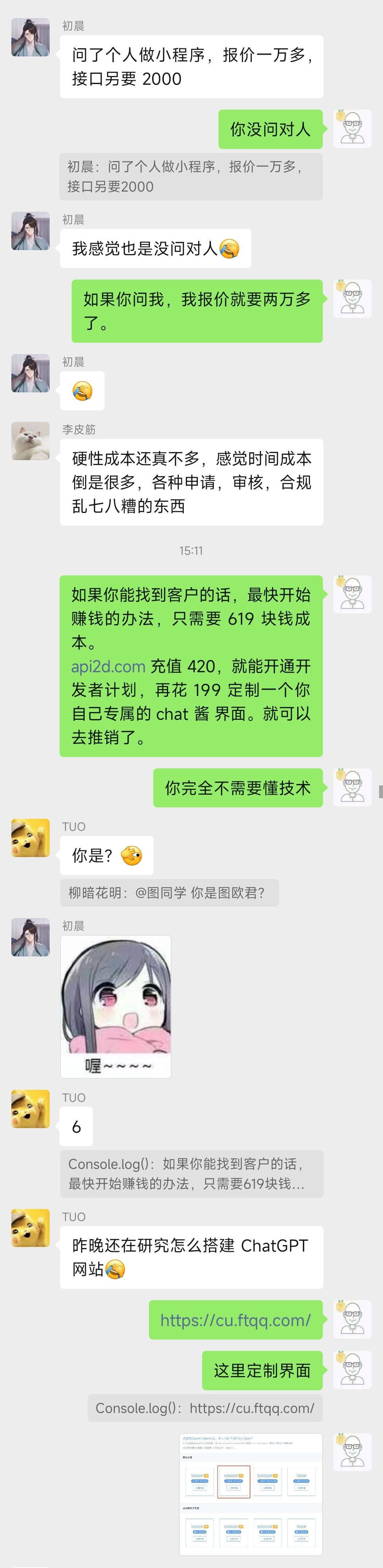 我刚才写了大概五六百字的一个教程,教大家怎么不需要开发也可以卖 ChatGPT 服务赚钱,结果就在写完那一刻,我要复制时,本来想按 cmd c 结果不知道按到了什么键,微信重启了,写好的有详细步骤的教程没了,所以只好给大家看群聊截图了,能领悟到多少就看大家的了。