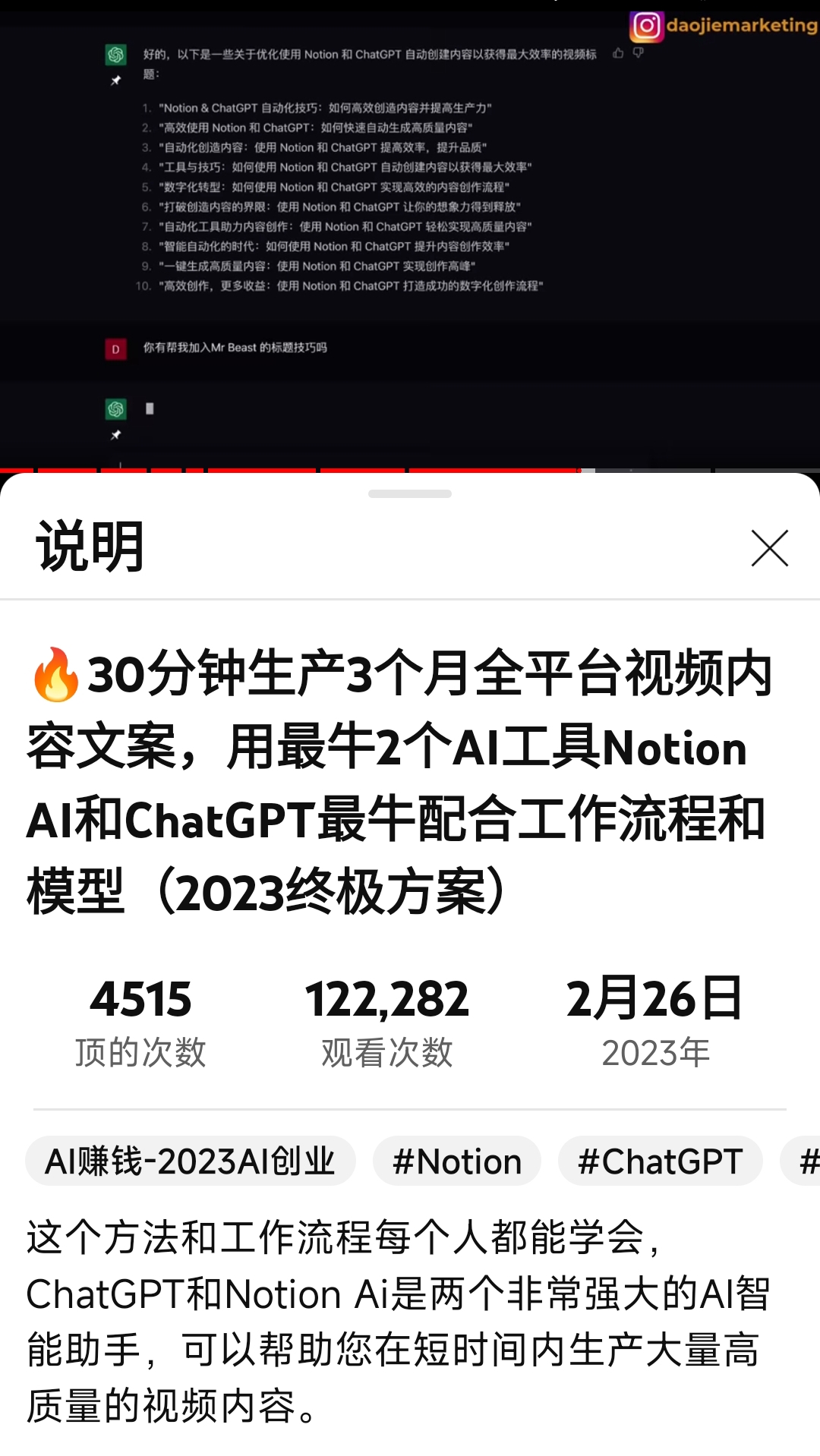 在 YouTube 上看到了一个视频,主题为用 Notion AI + chatGPT 重塑内容生产工作流程。