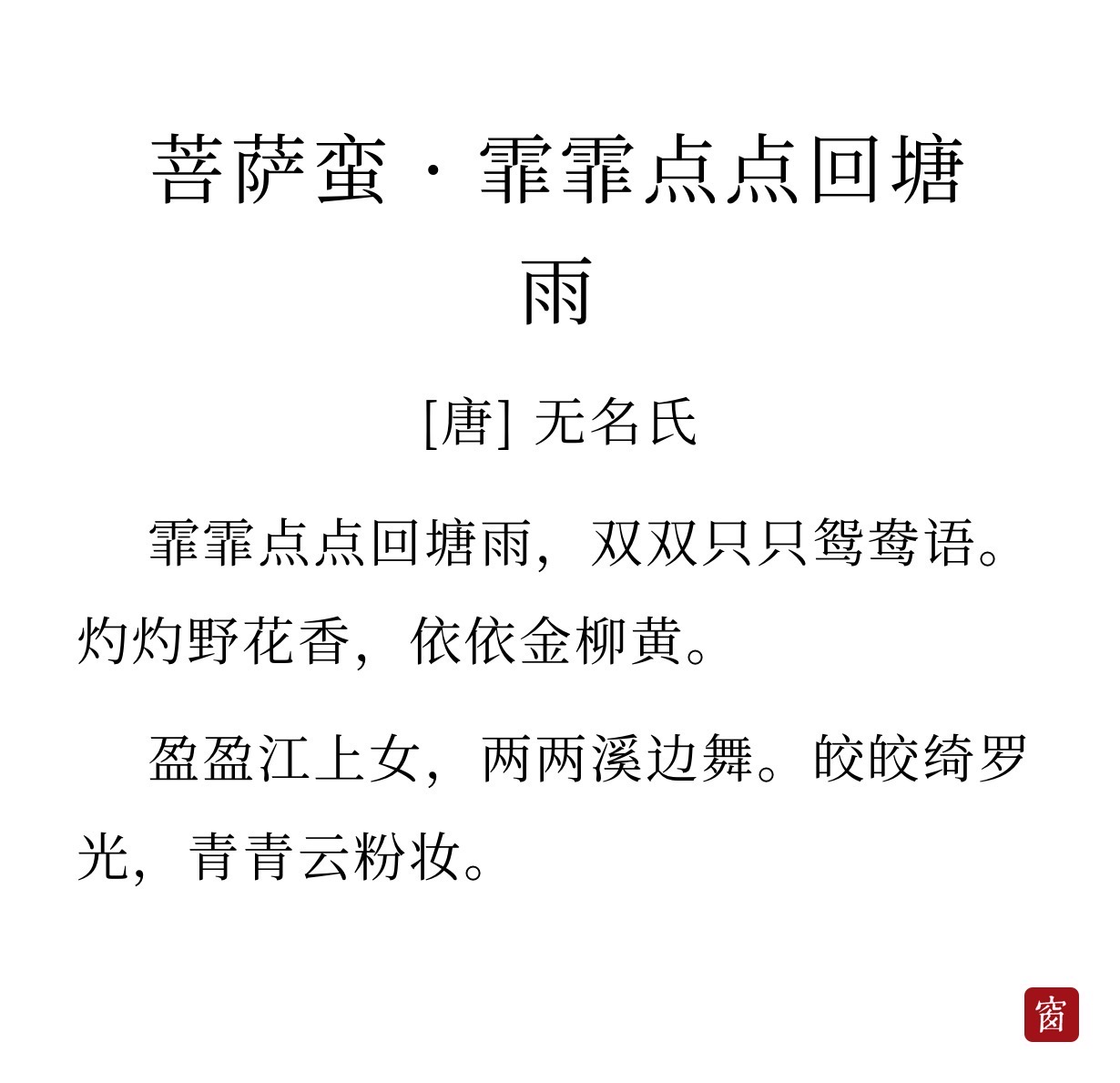 霏霏点点回塘雨,双双只只鸳鸯语。灼灼野花香,依依金柳黄。