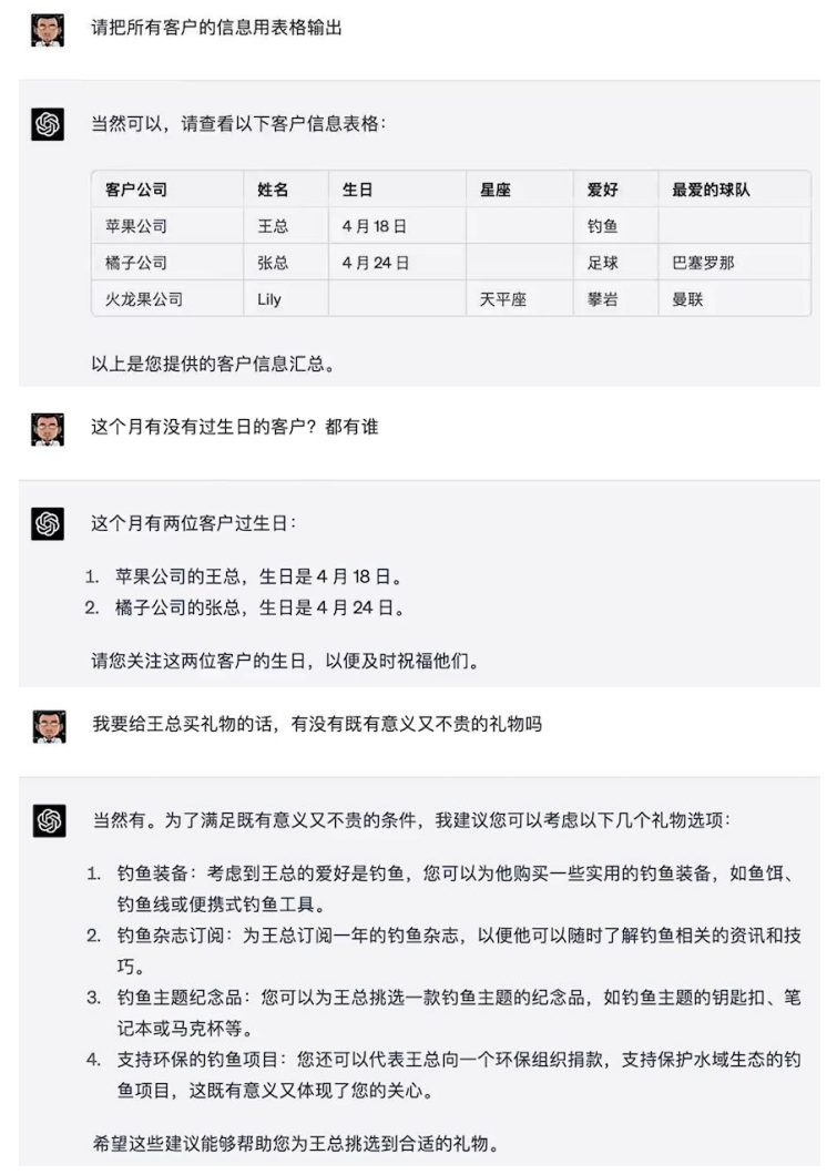第三步,我会让它整理出所有的客户信息表格,并且针对性的使用,例如每个星期之前提醒有没有本周过生日的客户,针对这个客户有什么样的爱好可以去拉近下关系。