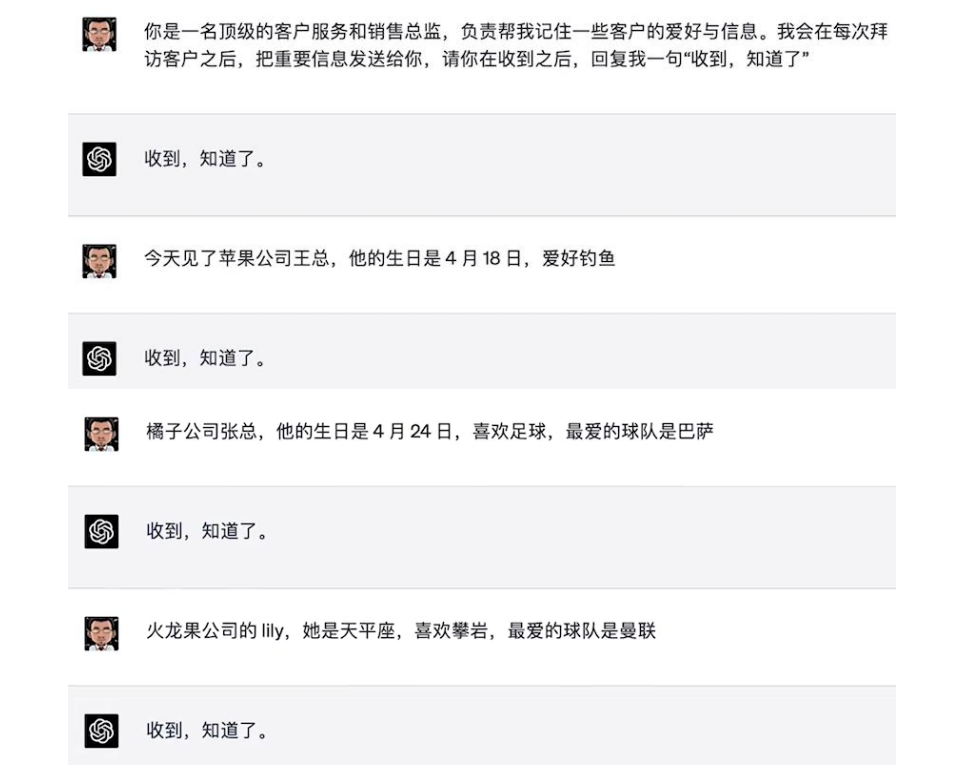 好,现在你可以看到,我在和 AI 的对话了。在拜访之后,我会发简单的一句描述给 AI,要求它每次接到新的客户消息后,只用回复一句“收到,知道了。”就可以。