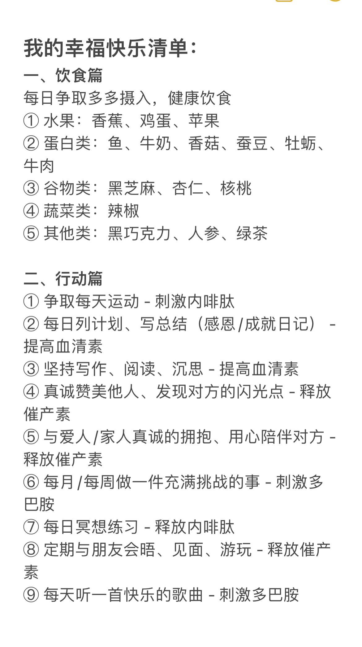 - 健康饮食、规律作息、多晒太阳、坚持写作、冥想。