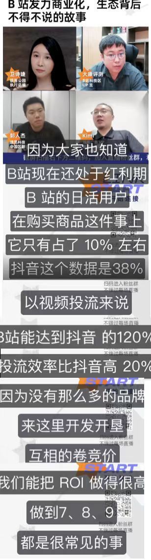 需要很大的精力,因此UP主也很难做好选品,商务的事情,于是需要很强大的MCN机构,B站暂时没有到达抖音那样的体量,抖音现在日活7-8亿,所以优质MCN机构都冲的抖音,B站UP有很强的输出能力,但是对货盘选品的把控远远不如其他平台达人。
