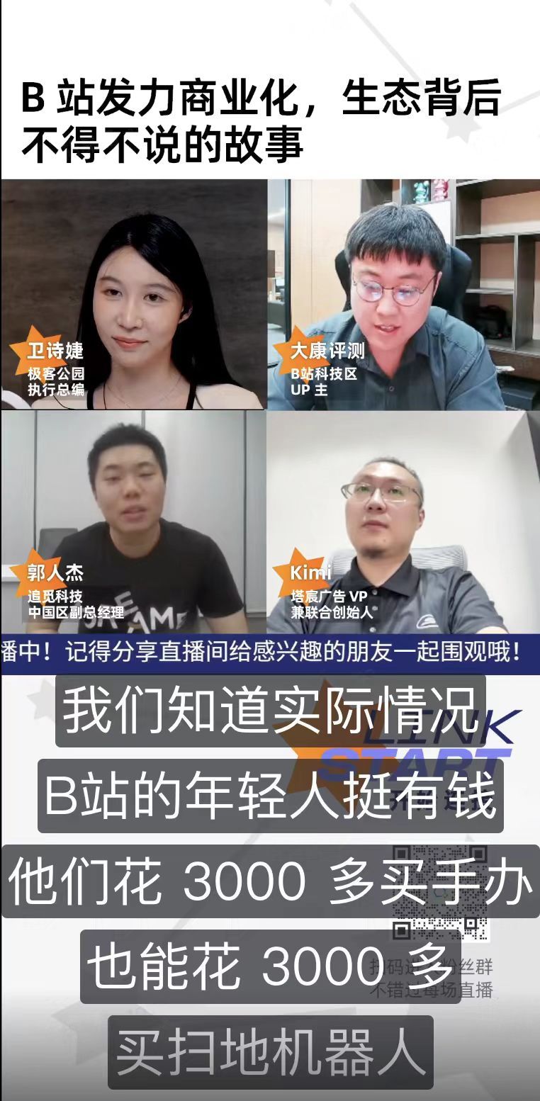 很多人觉得b站用户没钱,但追觅团队认为,b站用户能花3000多块钱买手办,那也能买得起3000多元的扫地机器人,而且善于学习的人们就算当下没钱,在走进职场之后的赚钱能力和消费能力都不会太差的,投b站是即抓现在又抓未来的一套打法。