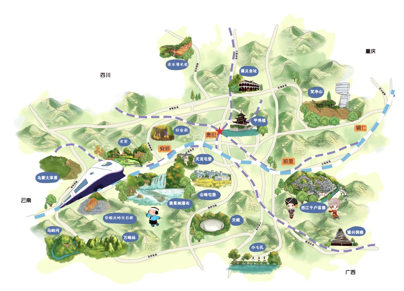 🏠拖家带口的话,那我建议不多走动了,走贵阳+安顺地区、贵阳+黔东南高铁路线比较合适,安顺地区可以看溶洞和喀斯特地貌,黔东南分两点:凯里地区和榕江地区,凯里地区有西江千户苗寨、村BA等景点;榕江地区有村超、大利侗寨、肇兴侗寨等经典。贵阳可以多逛逛。