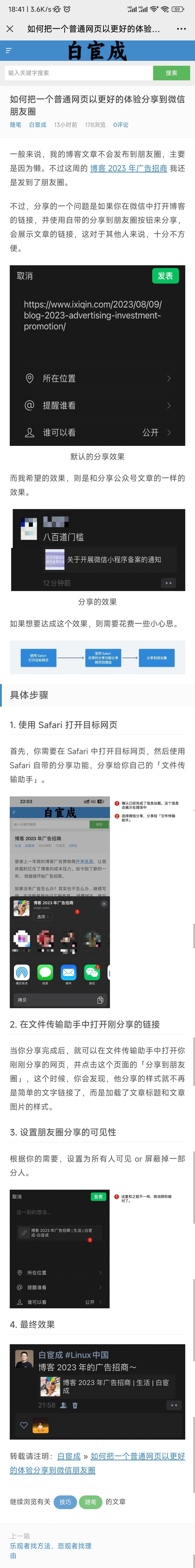 @白宦成 写了篇文章来介绍如何分享网页到朋友圈。