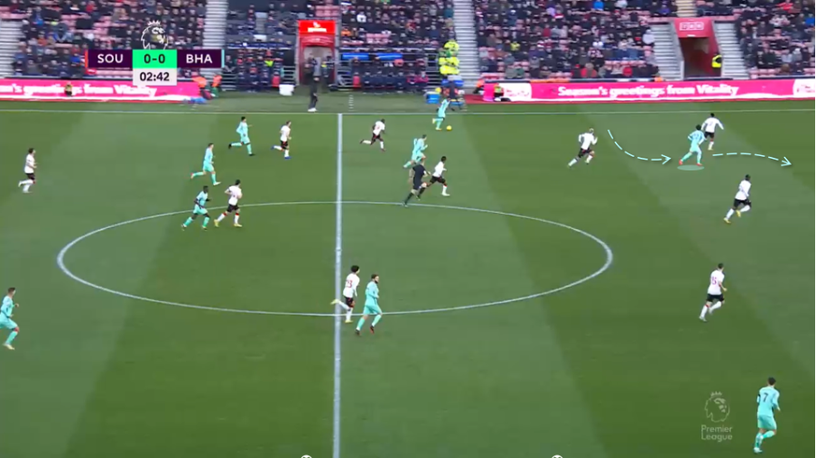 布莱顿保持高速进攻的主要方法有两种。首先,如上所述的将比赛放慢以引发逼抢,并争取在对手回撤时处于先推迟1v1的心态之下去进攻。所以三笘薰和马奇这样的带球能力突出的球员可以在尽可能宽的边线位置接球,并迅速推进到进攻三区。其次,非常重要的一点是,布莱顿通常寻求创造的是动态优势,而非空间优势——他们的传球喜欢找到那些正在奔向空间的球员,或者是已经在移动中并且在接球时能保持进攻势头的球员。在他所举的图例中,见图7,三笘薰正在观察并跑位,以进入到对方的肋部空当,并且为Estupinan创造接球和前进空间。