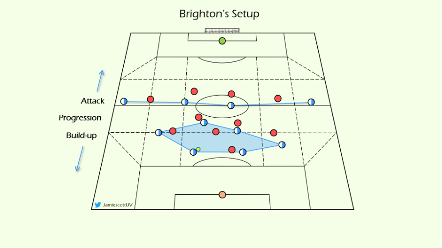 他的球队通过创造非常规非正统甚至违反直觉的比赛阶段来获得优势,通过在不同情景下加速/减速比赛来实现这一点。像上述提到的“停顿”,以往多被视为高风险且很糟糕的踢球方式。但这正是他们的比赛精髓,反其道而行之,布莱顿通过随后的快速推进和进攻,最大限度地利用了这种策略产生的优势。
