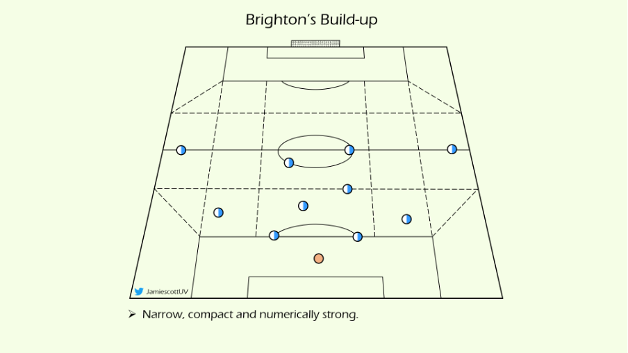布莱顿开局通常以4231布阵(图1),然后控球时的每个阶段形成非常不同的结构。后场的组织进攻,他们会形成一个紧凑的4-2或4-1结构(图2),这种扁平狭窄的紧凑性通常会吸引对手进行高位逼抢。在躲过对方的紧逼并推进到中前场时,布莱顿会利用最大宽度,使得两个边锋接球时可以在1v1的情况下发动快攻(图3)。