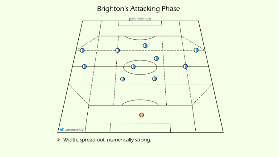 虽然德泽尔比的布莱顿有类似理念,因为他们经常在或者制造攻防转换的状态来比赛,但他喜欢使用的是最大宽度。独特和牛逼之处在于,他们也实现了高速的进攻。