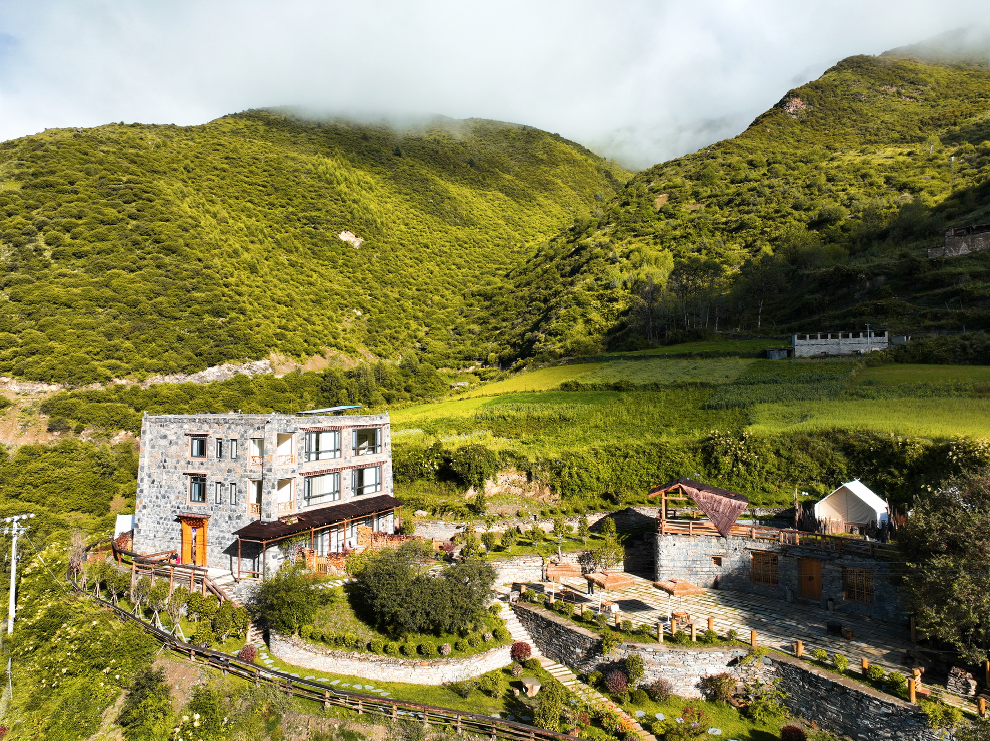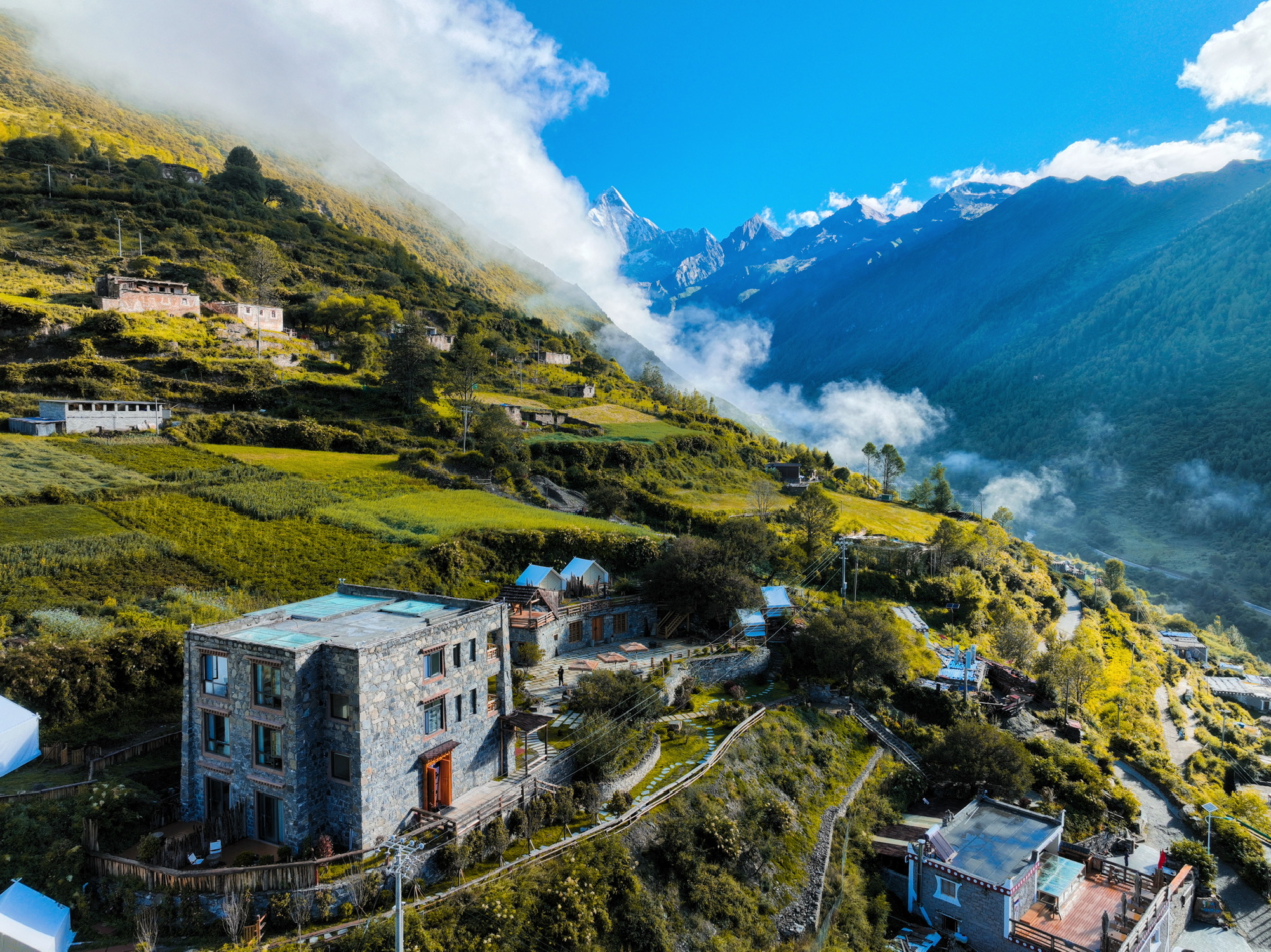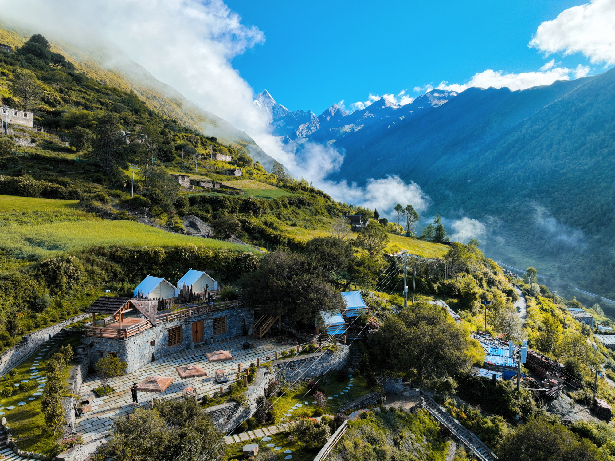 民宿位于长坪沟的半山上,住二楼以上房型拉开窗帘就能看到四姑娘山,晨曦的风景超棒,云雾缭绕,夜晚在花园里就能看银河,还有个水吧,有酒、有围炉、有烧烤,还有两只猫可撸,不想出门的,可以在民宿瘫一整天。