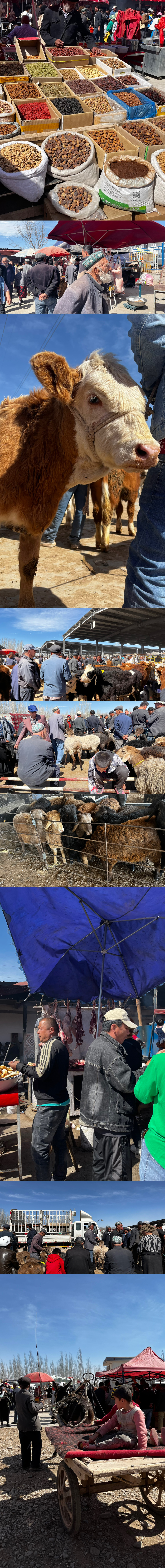 个人感觉这里是最能够感受到南疆人文的地方,也是最值得去的一个地方。基本上没太有内地人,也没有商业化的店铺,一切都是最真实最原始的模样。只有每周日会有,从市区打车过去大概30元左右,水果,干果,各种本地的食物都有,还有超级多的牛羊,上次和同学还在这里吃到了免费的冰淇淋。这里很多本地人特别是年长听不太懂,可以找这里的小孩子帮忙翻译。一直往里走就可以看到他们交易的地方,可以看到非常非常非常多的牛羊,建议戴口罩(因为这个地方的土还是蛮大的),一定不要穿白色的鞋)我上次穿的白色的鞋回来之后变成黑的了,还踩了好多牛羊的粑粑。🥹)