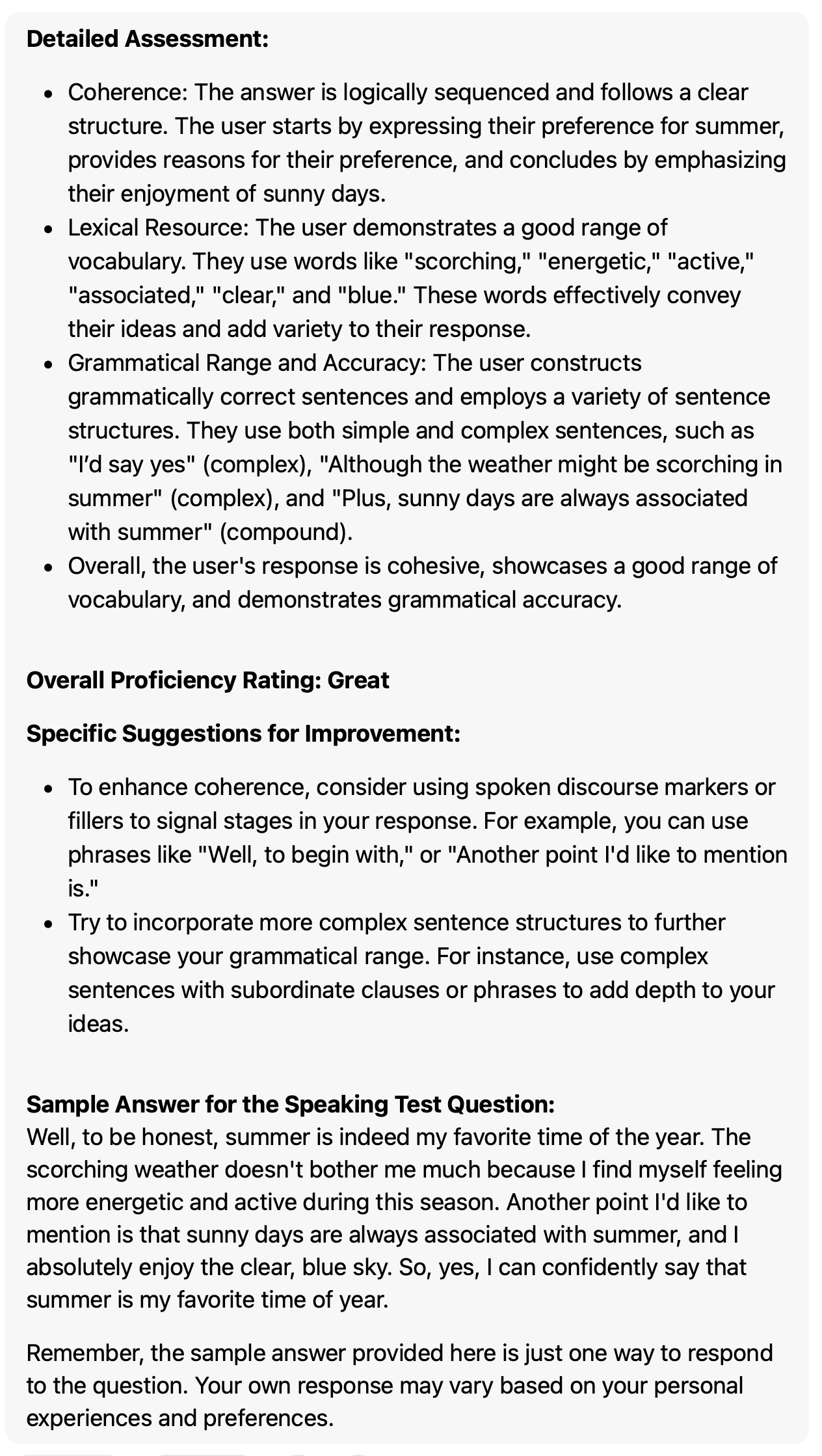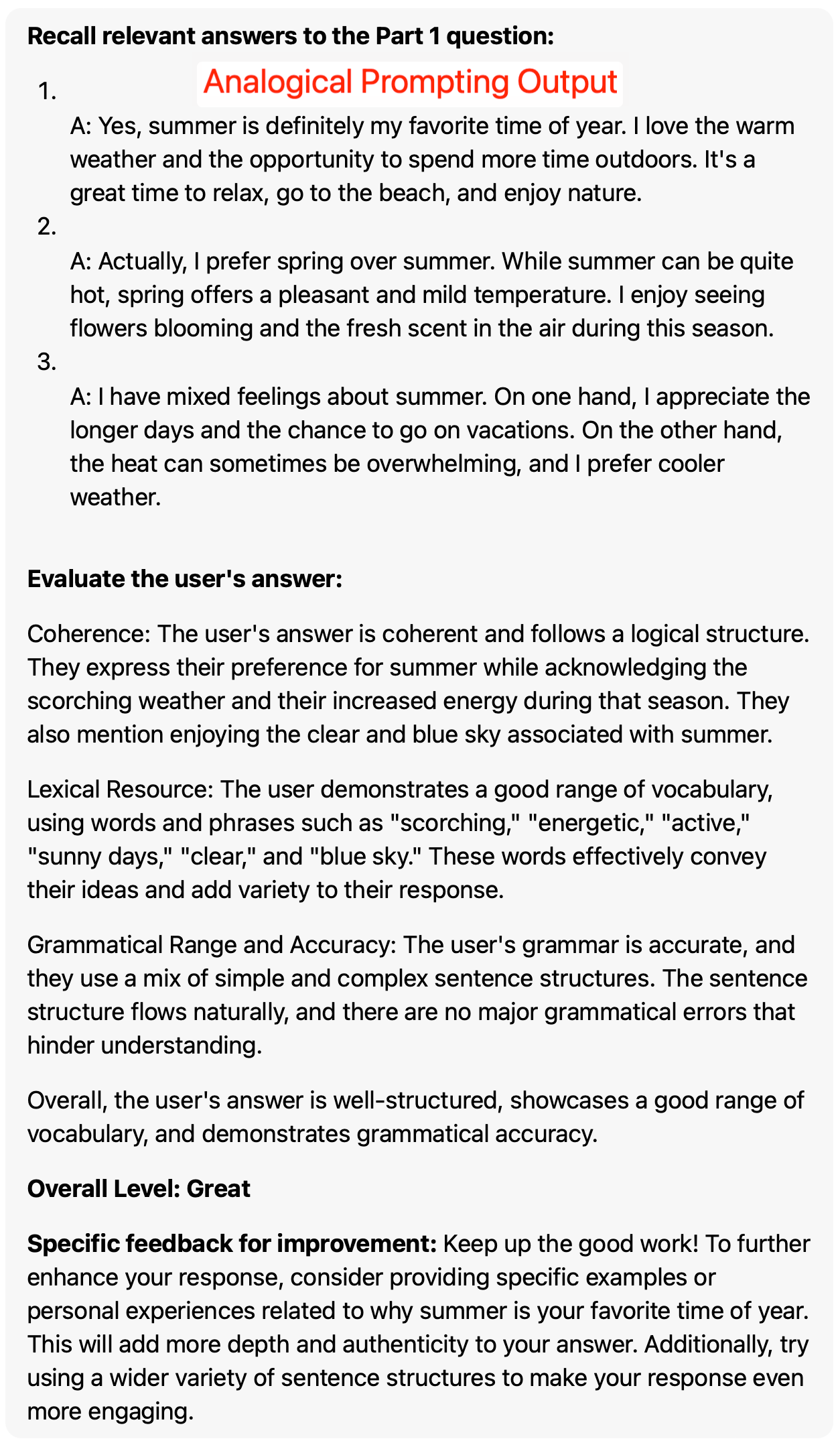 于是,针对我自己之前写的用于评估雅思口语考试答案的 prompt,重新按照 Analogical Prompting 的技巧写了一版,输出和我之前的版本差不多,但是 prompt 更精简了。