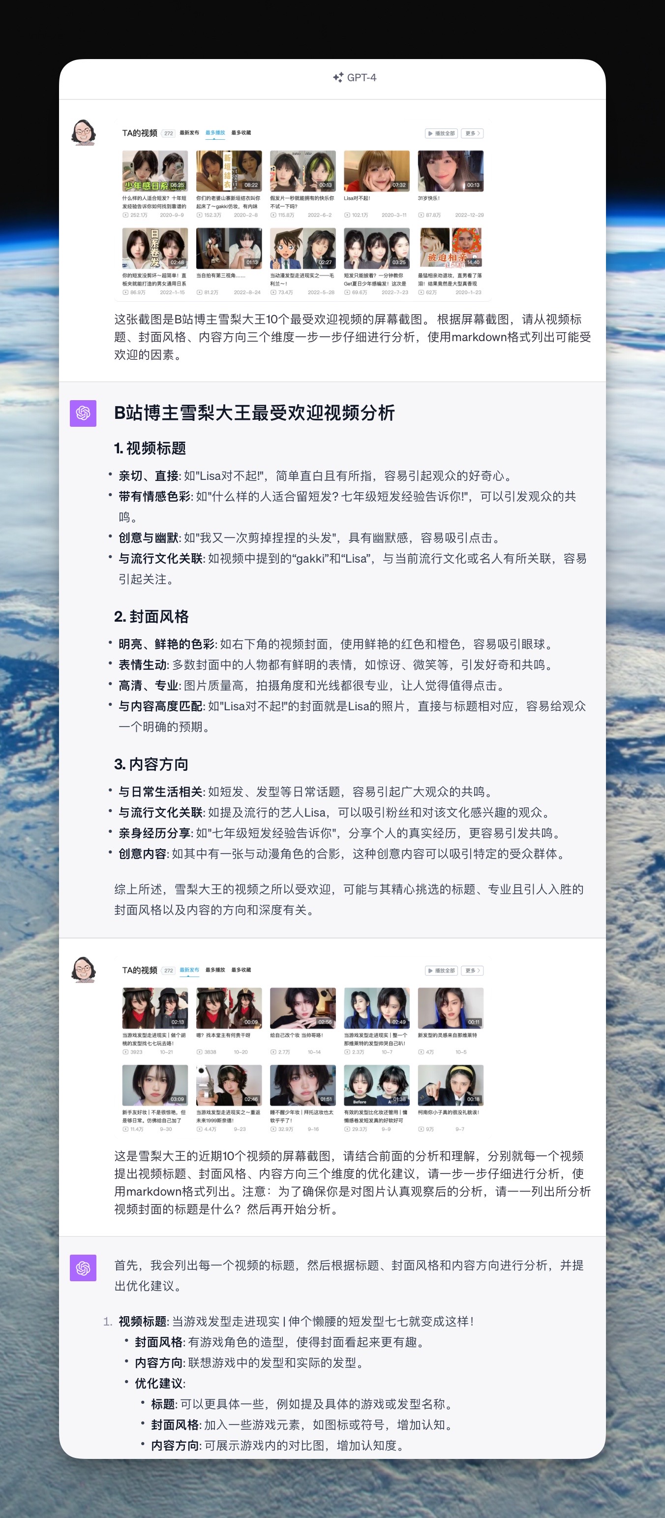 2、由于生成回复和对图像的识别高度有关,建议不要如我截图一般一下提供,可以分别提供每条视频截图,然后分别给出建议。以免过多内容 GPT 识别错误后反复回滚。