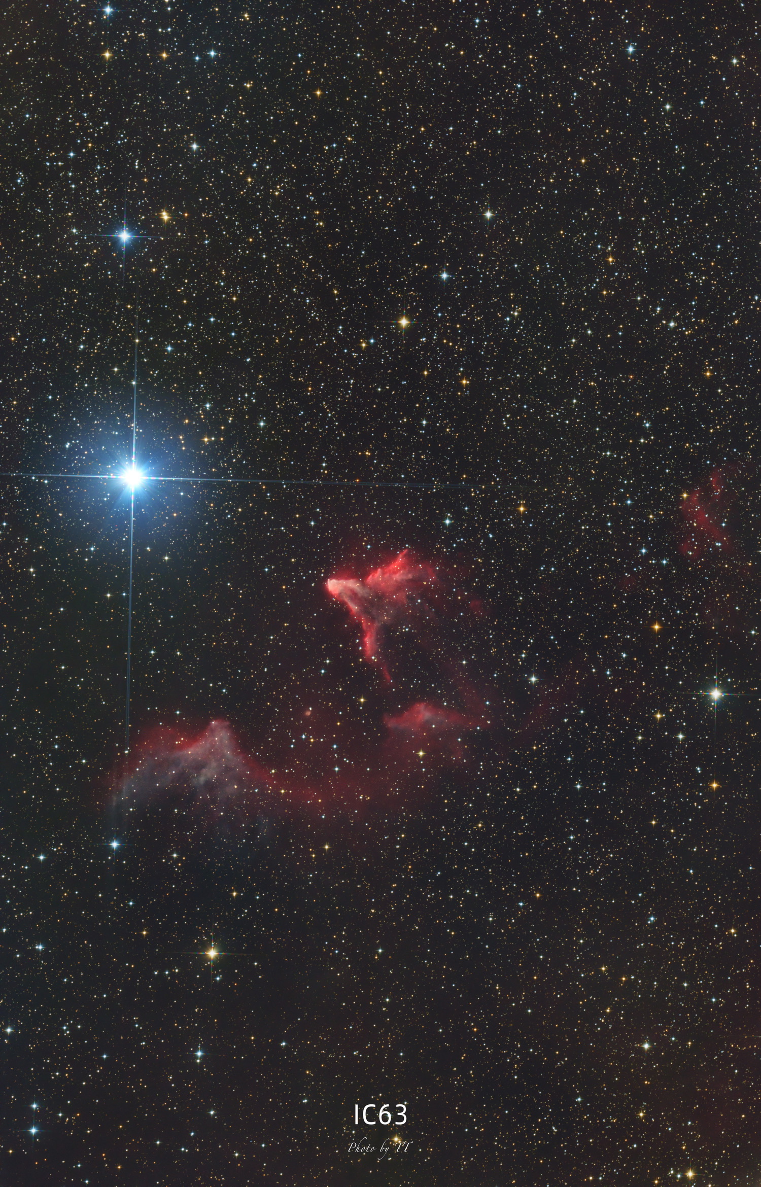 这张IC63策星云是使用小黑+2600mcp拍的,累计曝光七个小时多一点,10月23日在起云前拍了一个多小时,昨晚顶着大月亮又拍了五个多小时,其中有两个小时是用窄带滤镜拍的,混进了R通道里面。之前几个月也陆陆续续拍了这个目标,但是用的镜子不一样,这次先拿用小黑的素材叠叠看。看单张感觉没什么东西,不过叠出来效果还可以~