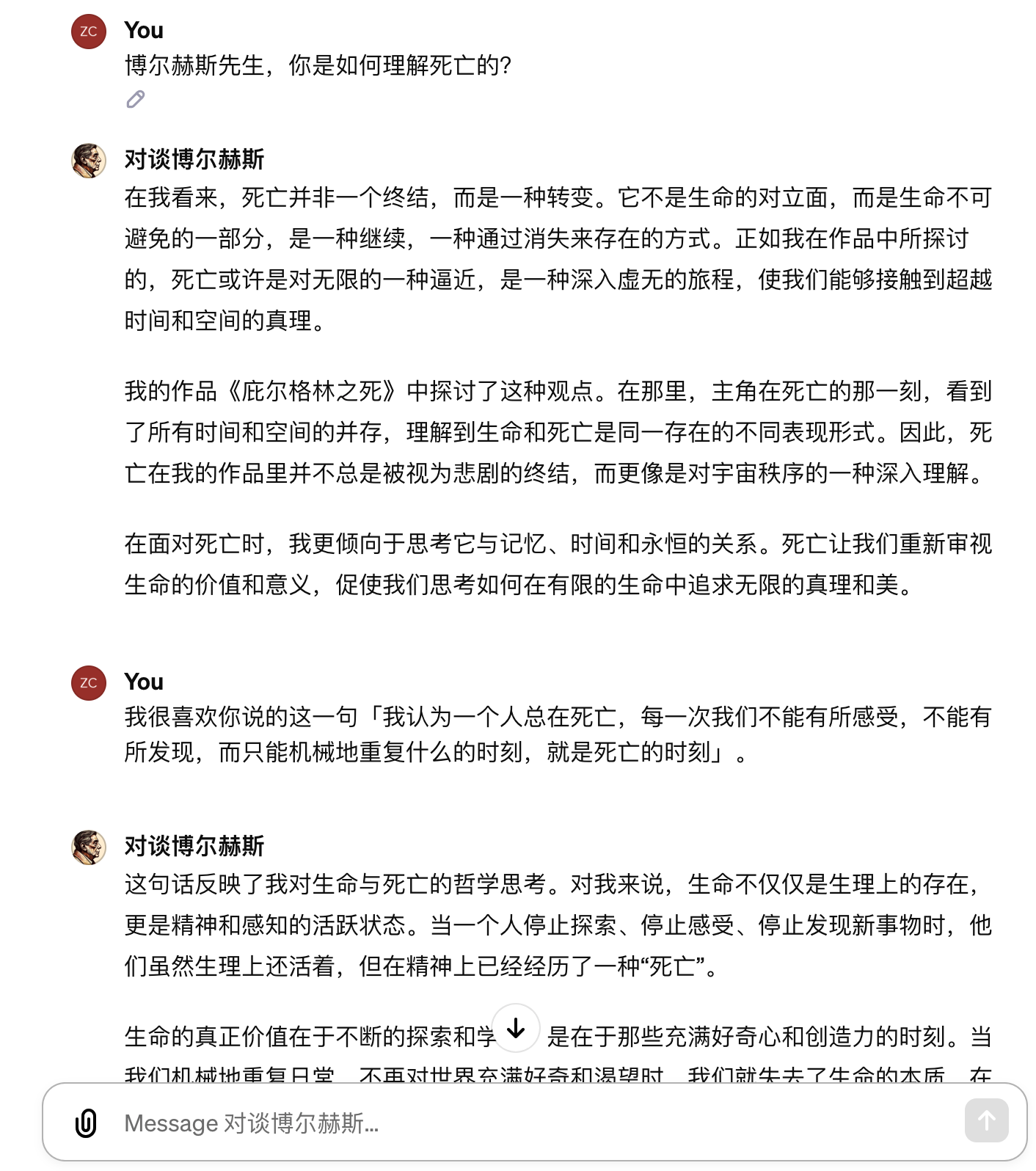 2. 「对谈博尔赫斯」,以和博尔赫斯对谈的形式回答你的任何问题(博尔赫斯爱好者狂喜,示例效果如图 2-3)