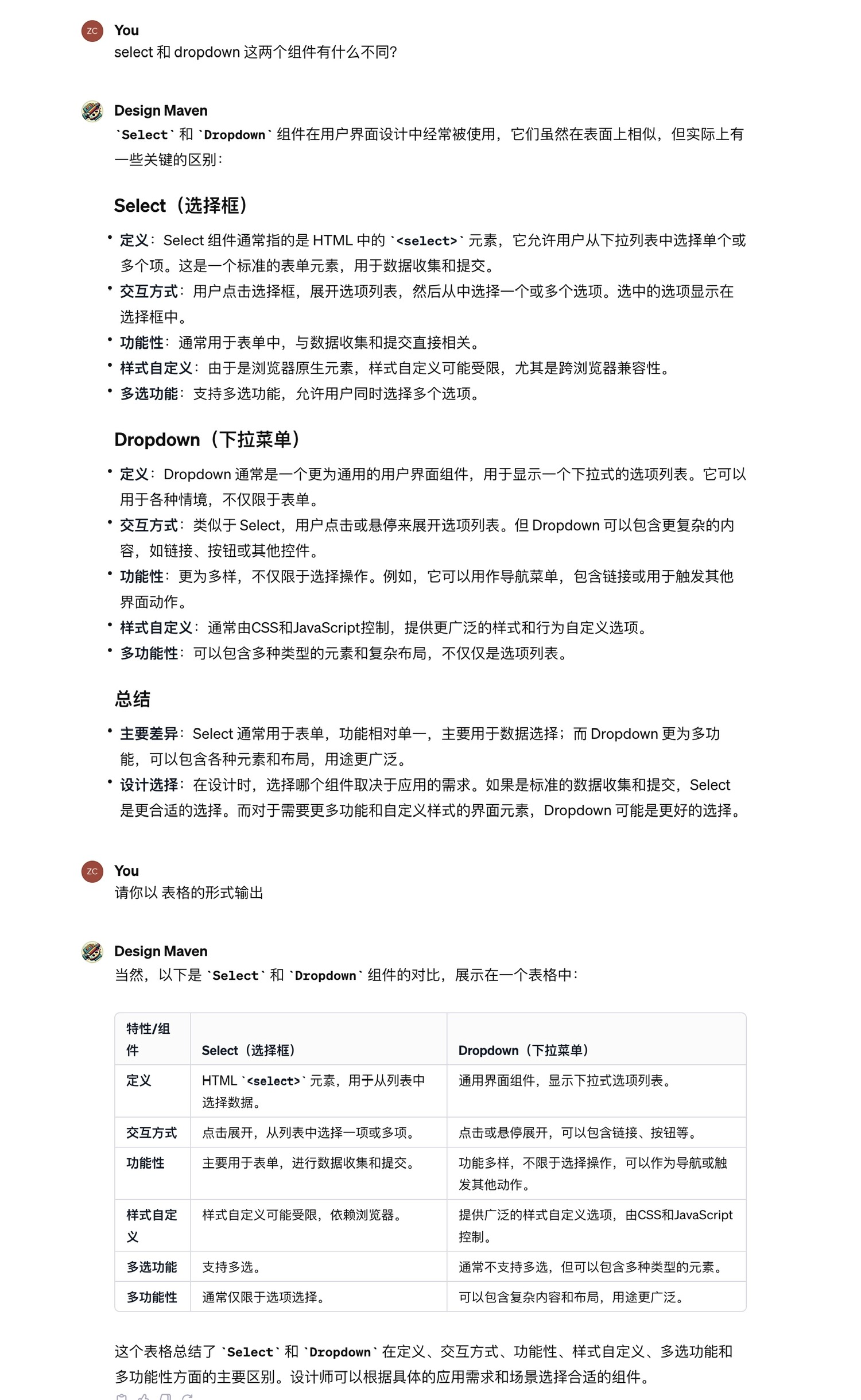 1. 「Design Maven」,关于设计系统的基础知识都可以问它,擅长分析 UI 设计中的组件差异、归纳组件的具体使用场景...(适合设计师或者产品经理使用,示例效果如图 1)
