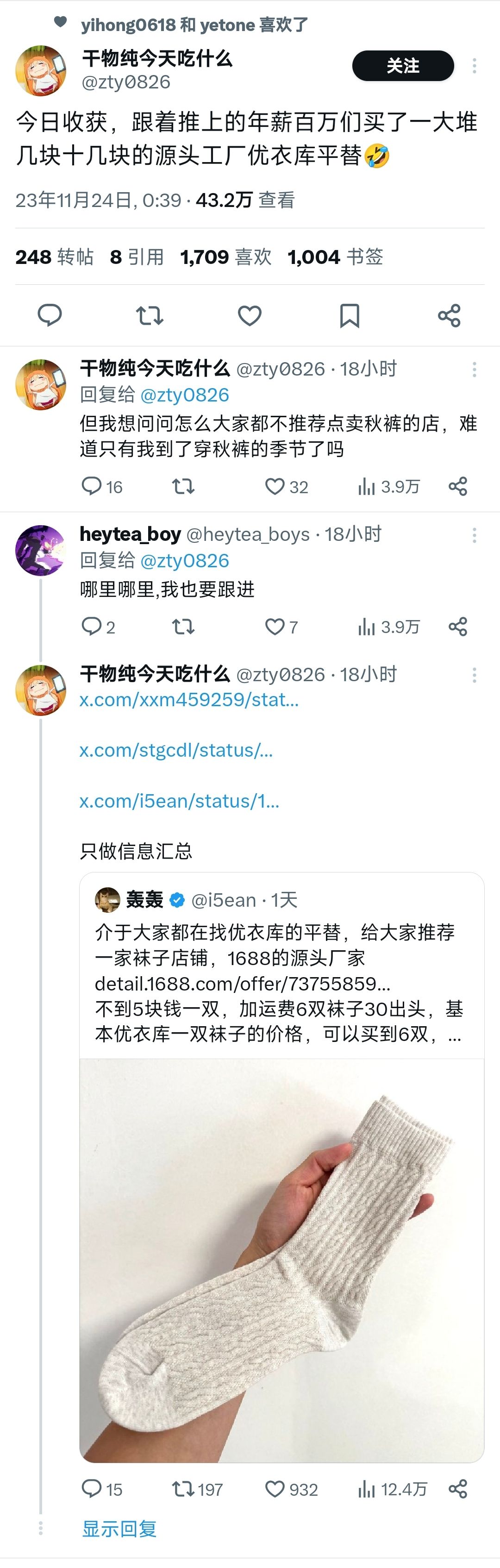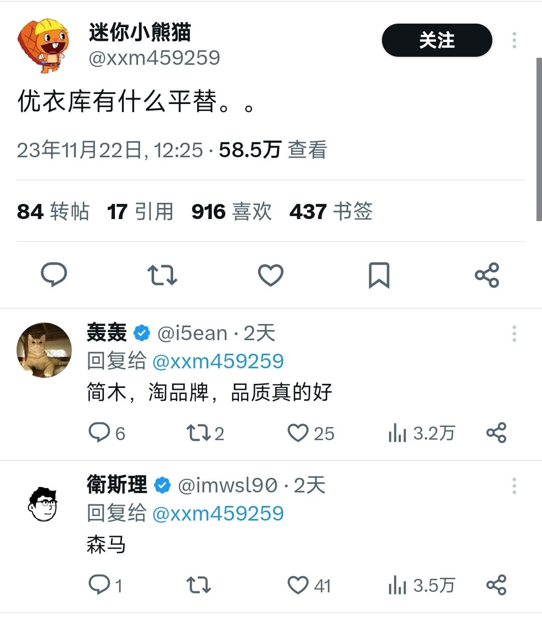 今天推特上阅读几十万的一个小热点话题,优衣库平替。