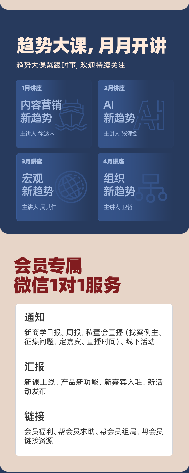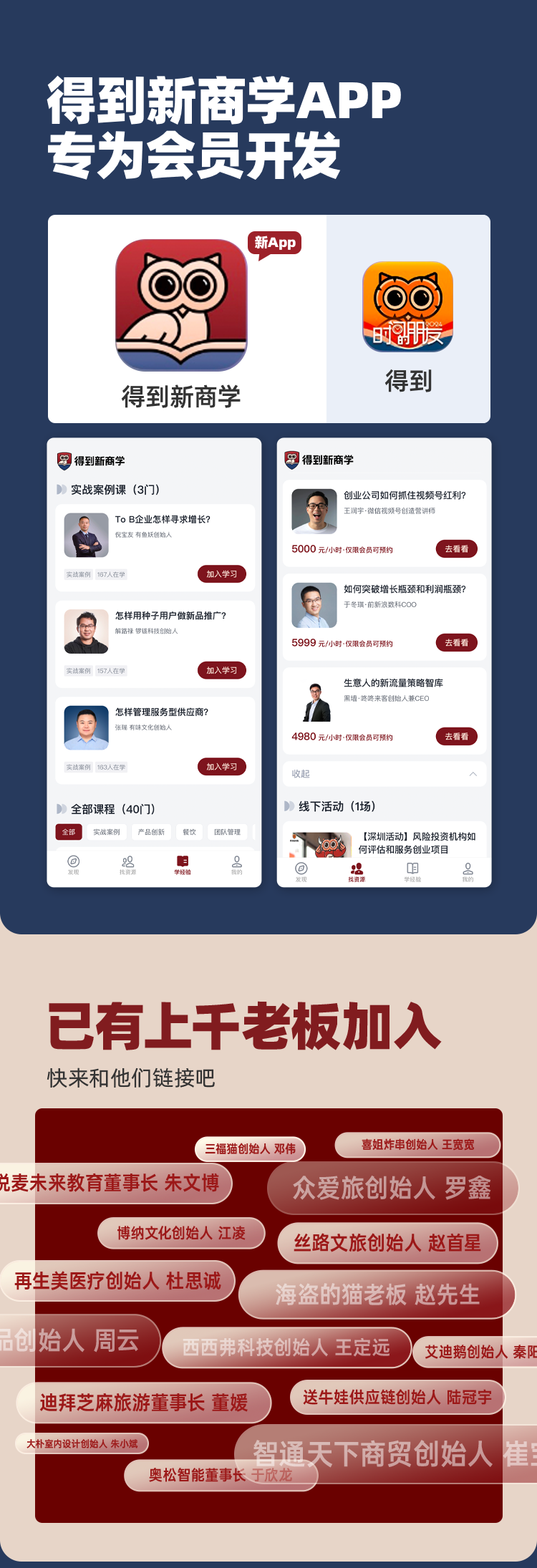 「经典商学课」和「实战案例课」,我理解为是这个权益包最容易被目标客群估算价值的部分,也是权益包的底座,对于匹配度高的目标客群来说,很可能有这两部分就足以值回票价了,且这两部分都是得到团队的看家本领,在价值交付上出现问题的概率较低,而价值交付一直是商学模式的老大难问题。